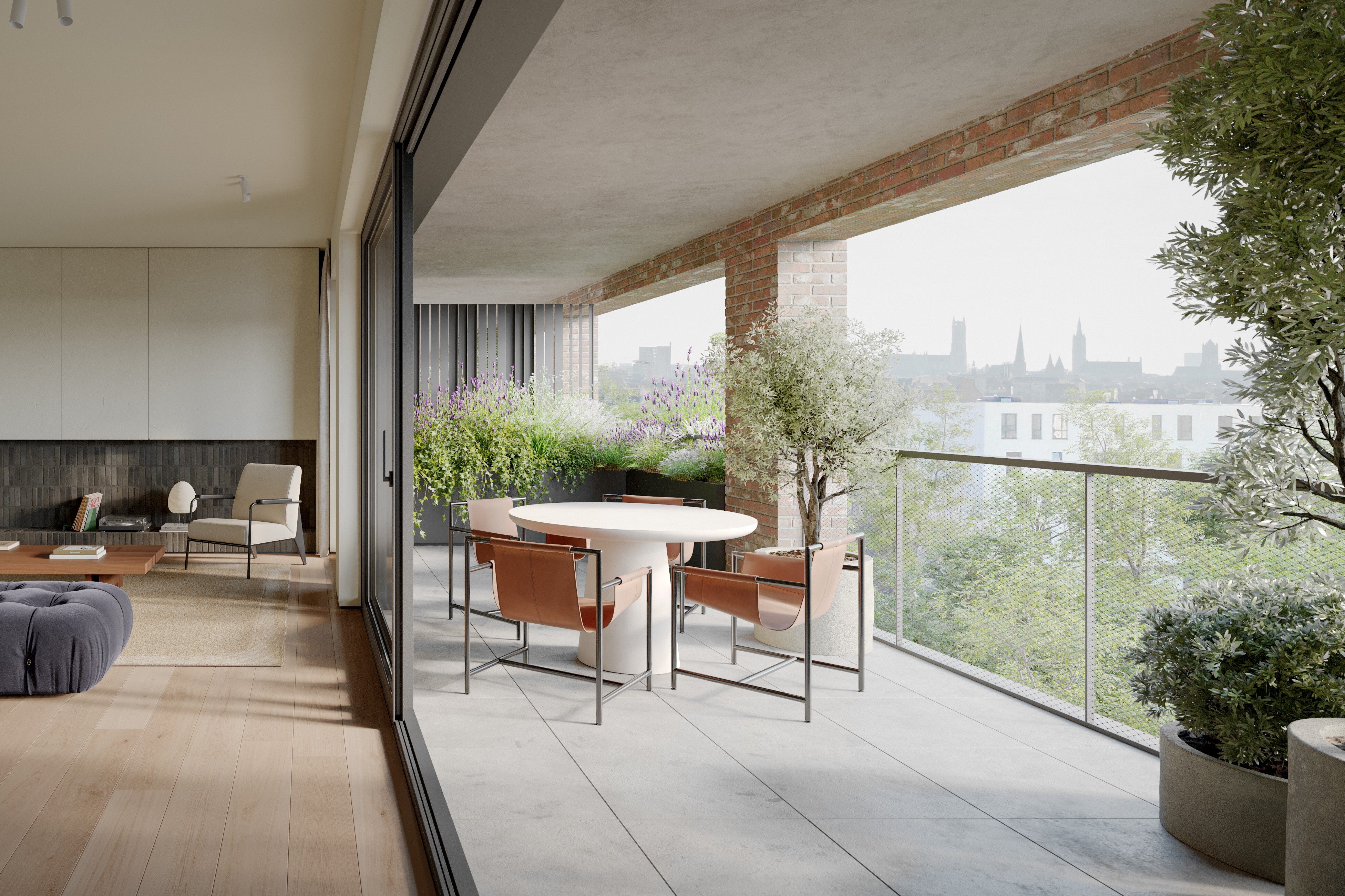 AXENT Architects inspireerde zich voor O’Vert op de oude site en bedrijfsgebouwen in de omgeving. Dat merk je aan de grote ramen en de hoge plafonds. De meeste appartementen hebben een dubbele oriëntatie waardoor het licht optimaal binnenvalt.