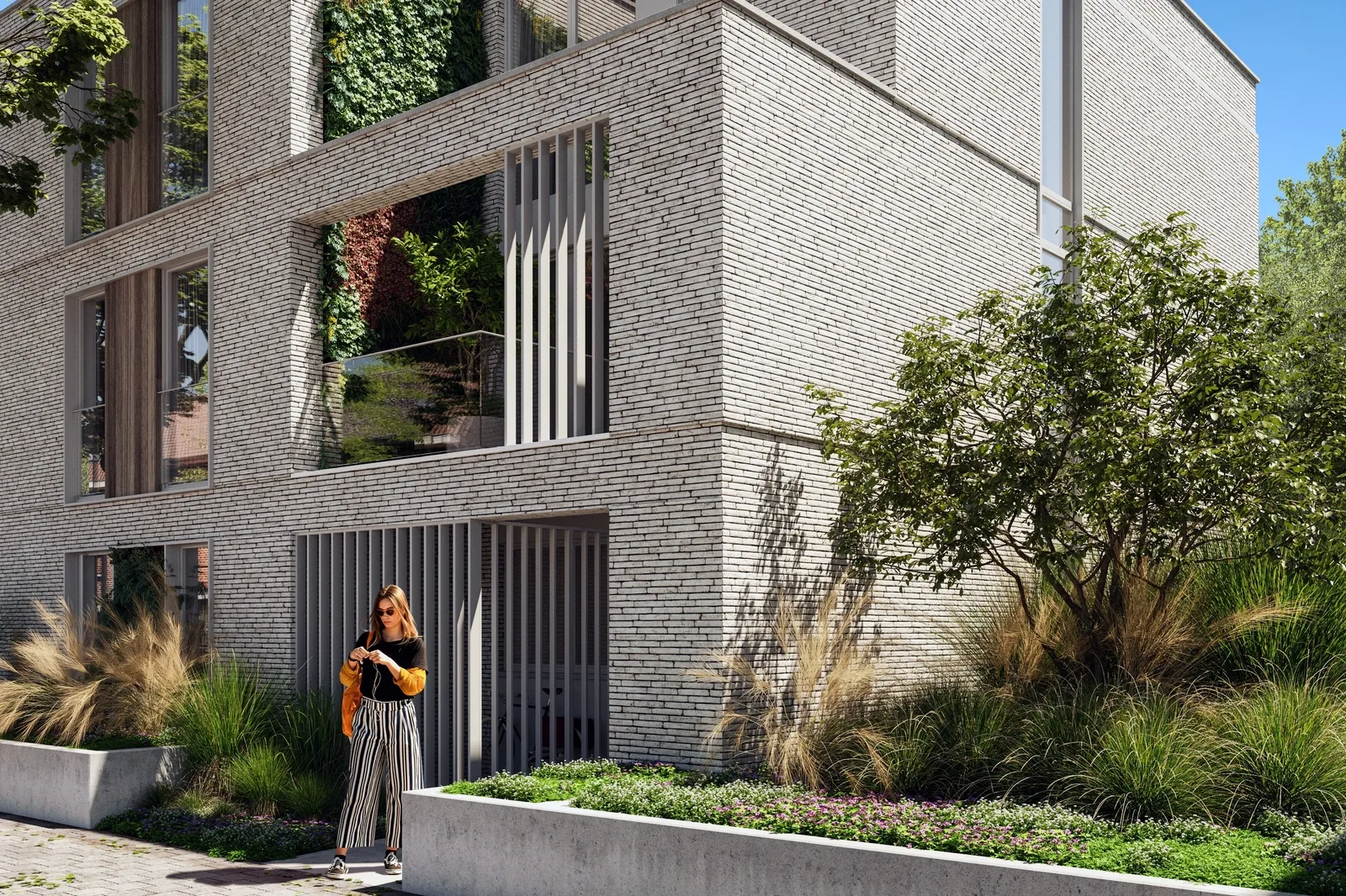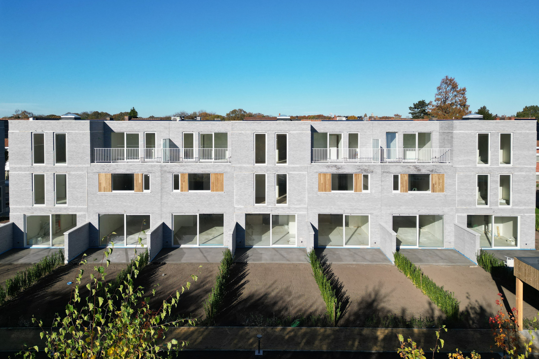 Specifiek voor 4 van de woningen schaart het lichte parament zich mooi naast esthetische raamkaders in licht metaal, met houten accenten en een begroend accent op het gelijkvloers. Dezelfde kaderaccenten worden gerealiseerd in de achtergevel, zij het onder de vorm van een panoramisch raam op schoothoogte op de verdieping. De overige 3 woningen zijn van het volledig doorzontype en zijn vooraan opgebouwd met een 2e teruggtrokken gevelschil die - naast een dynamisme in het straatbeeld – de voordelen biedt van een handige zone voor fietsen, ruime bergkast, en een geïntegreerd balkon op de verdieping. Vanaf dit balkon is de esthetische groene gevelwand bereikbaar voor onderhoud. Balkons zijn gerealiseerd in architectonisch beton die tonaal passen bij het parament.