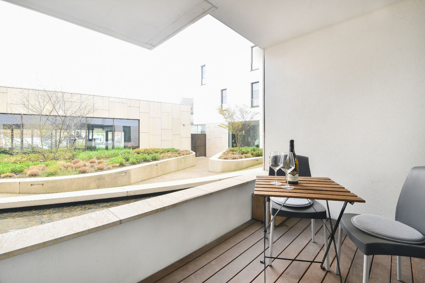 De indeling is als volgt: de riante, doorzon leefruimte (ca. 42m²) met een terras uitgevend op de waterpartij in de binnentuin, de slaapkamer met en-suite badkamer, een open, volledig geïnstalleerde keuken met annex koele berging, een afzonderlijk toilet en een tweede, technische berging. Het appartement bevindt zich op het gelijkvloers doch een stuk boven het straatniveau vrij van inkijk en een uniek uitzicht op het water.