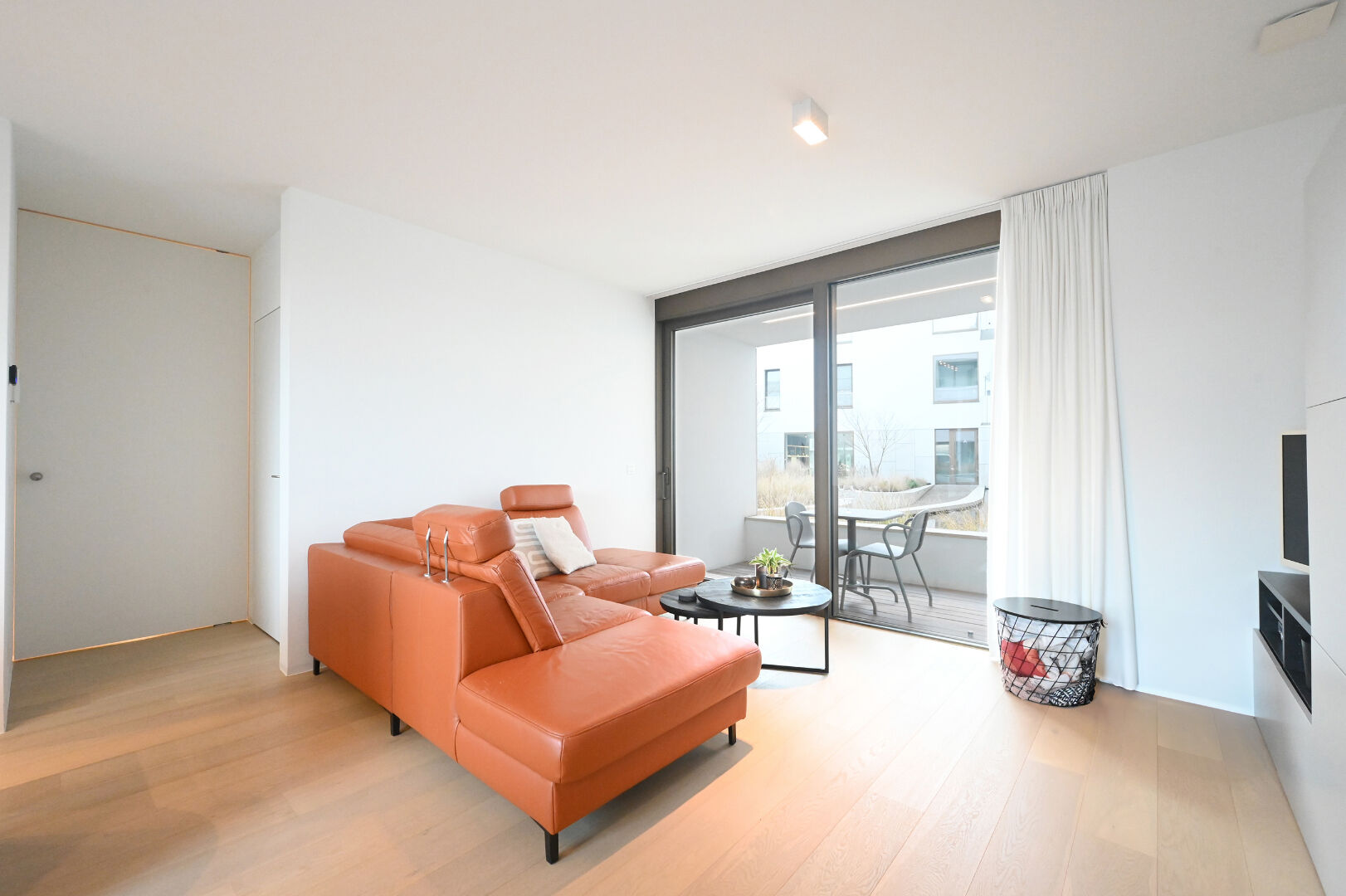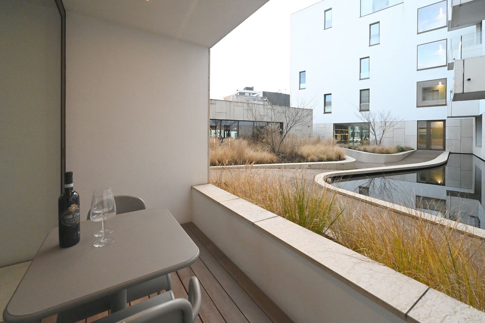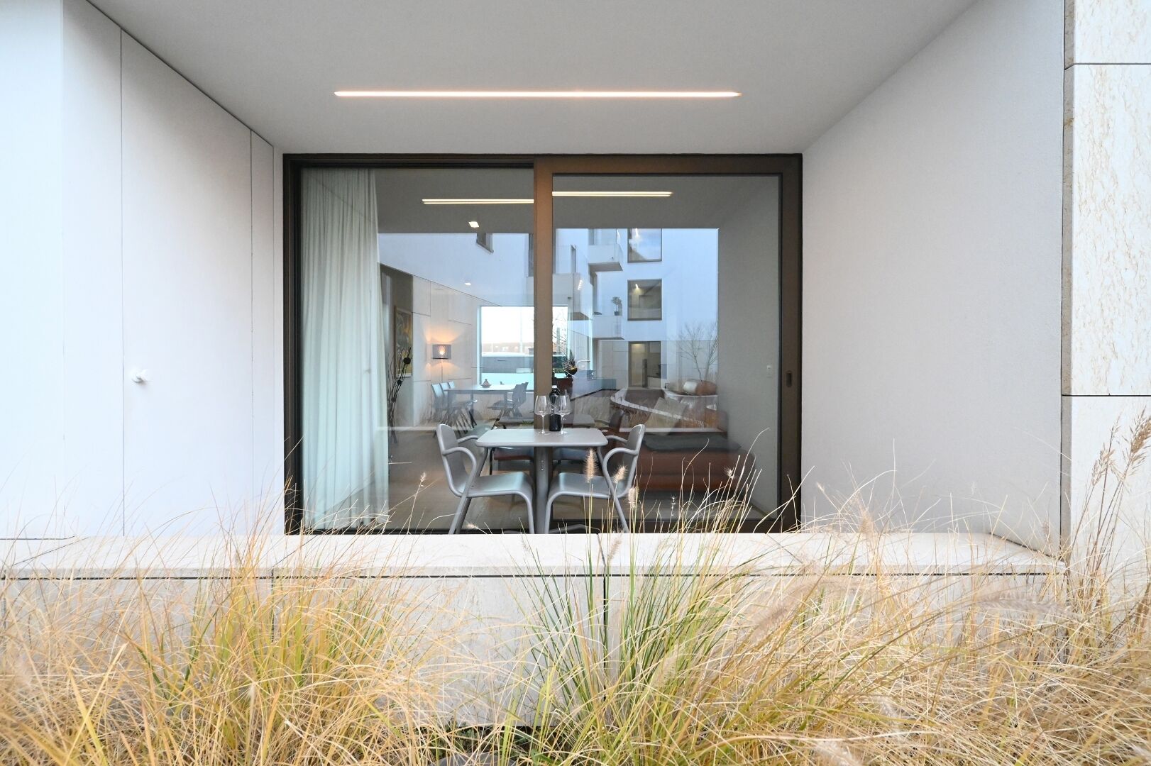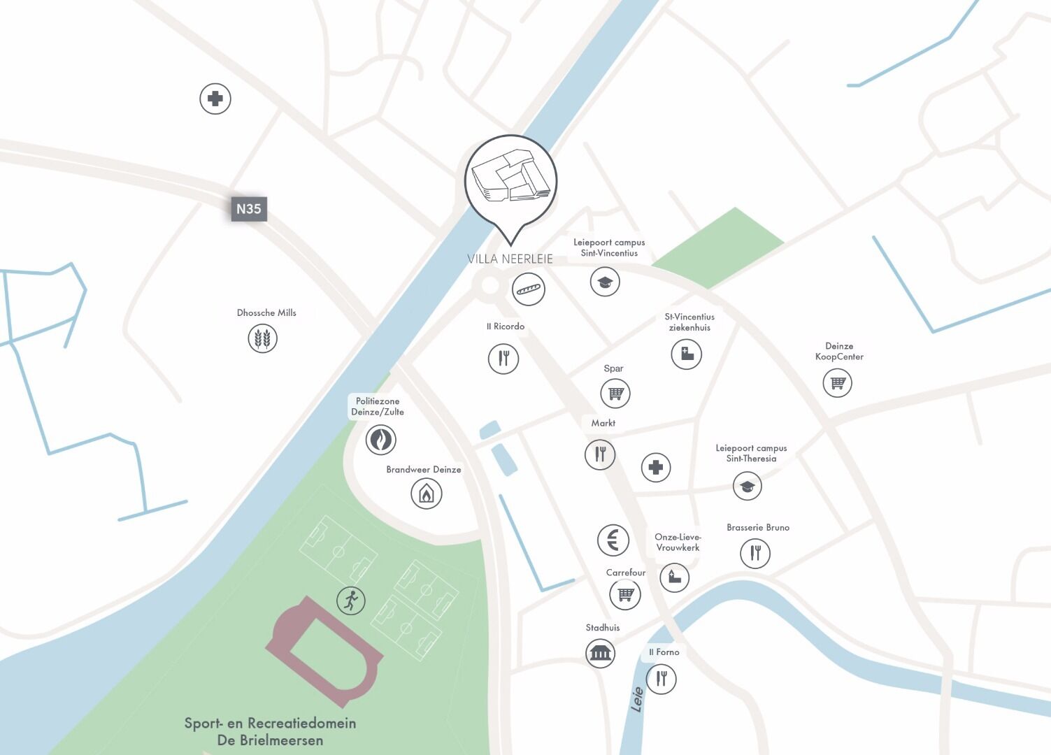 Dit doorzon appartement van ca. 92 m2 is gelegen op het gelijkvloers van het nieuwbouwproject Villa Neerleie in Deinze. Het appartement werd uiterst kwalitatief afgewerkt (eiken parket, Miele toestellen, een regendouche, high-end sanitair, etc.) en is voorzien van lichtarmaturen. Het bestaat uit een lichtrijke, doorzon leefruimte met open keuken en uitzicht over de Vaart, twee praktische bergingen, twee ruime slaapkamers, een gastentoilet en een badkamer met inloopdouche en dubbele lavabo. Daarnaast is er een zonneterras met terrasberging grenzend aan de leefruimte met zicht op de binnentuin met waterpartij.