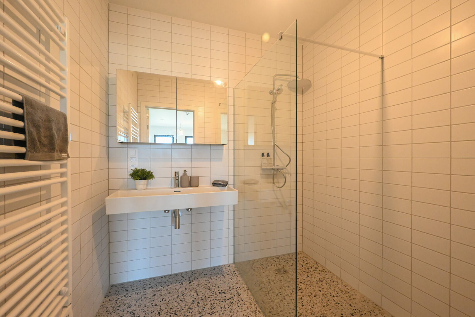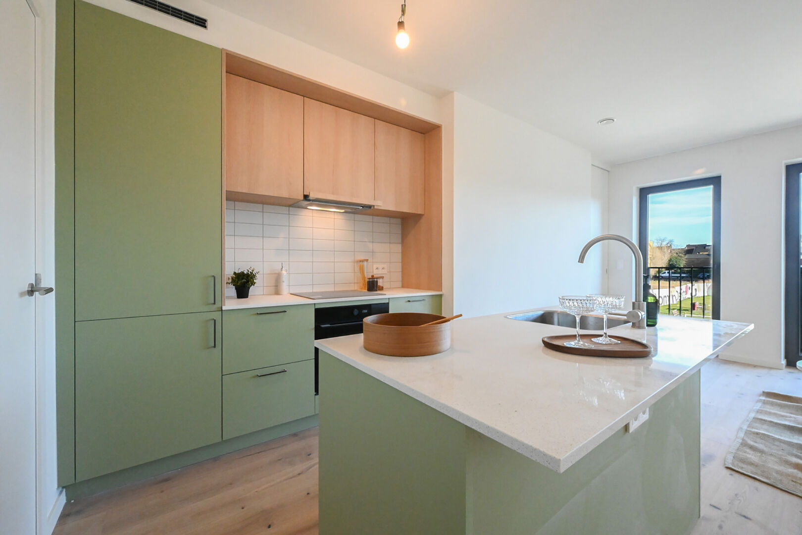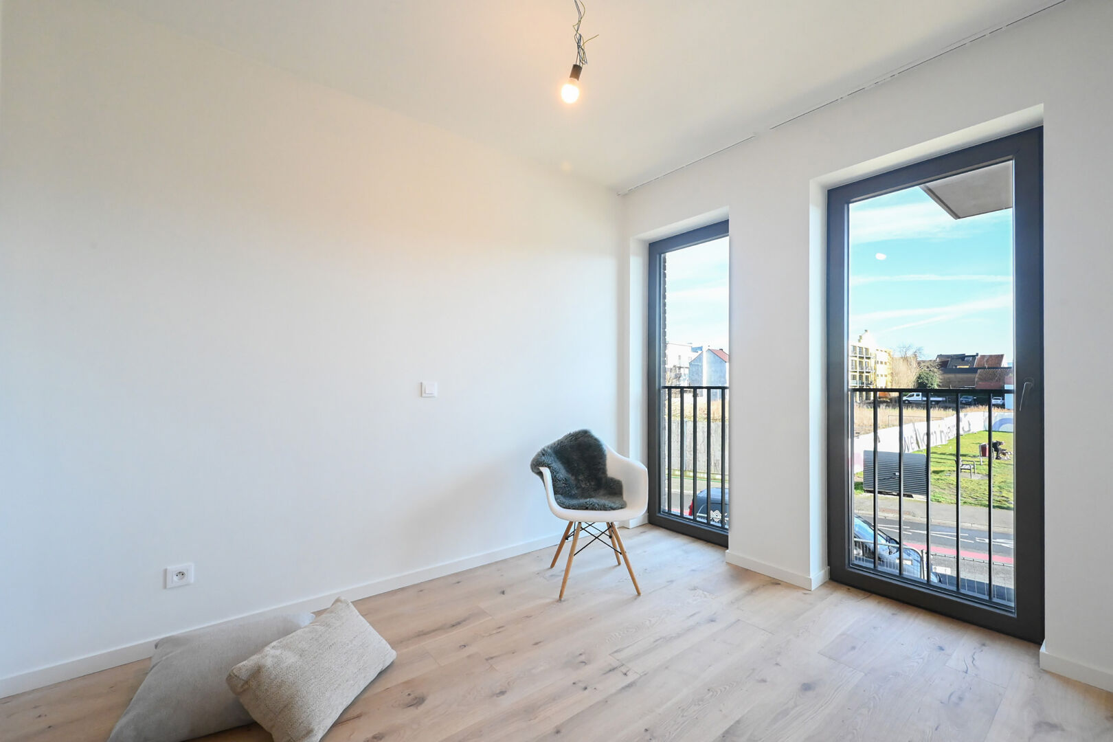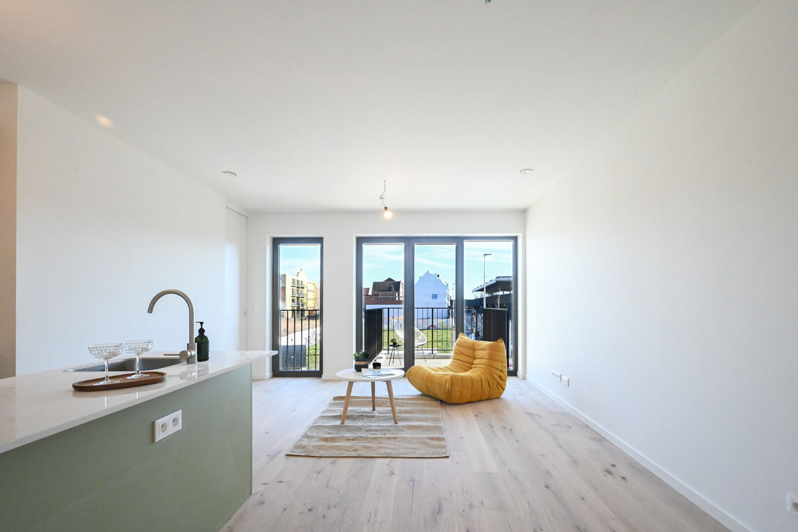 Het nieuwbouwappartement beschikt over een inkomhal met apart toilet, een lichtrijke eet- en leefruimte met open keuken en berging, één slaapkamer met extra veel plaats voor een bureau of dressing en een badkamer voorzien van een douche en wastafel. Het appartement heeft daarenboven een oostelijk georiënteerd terras van 8,10 m².