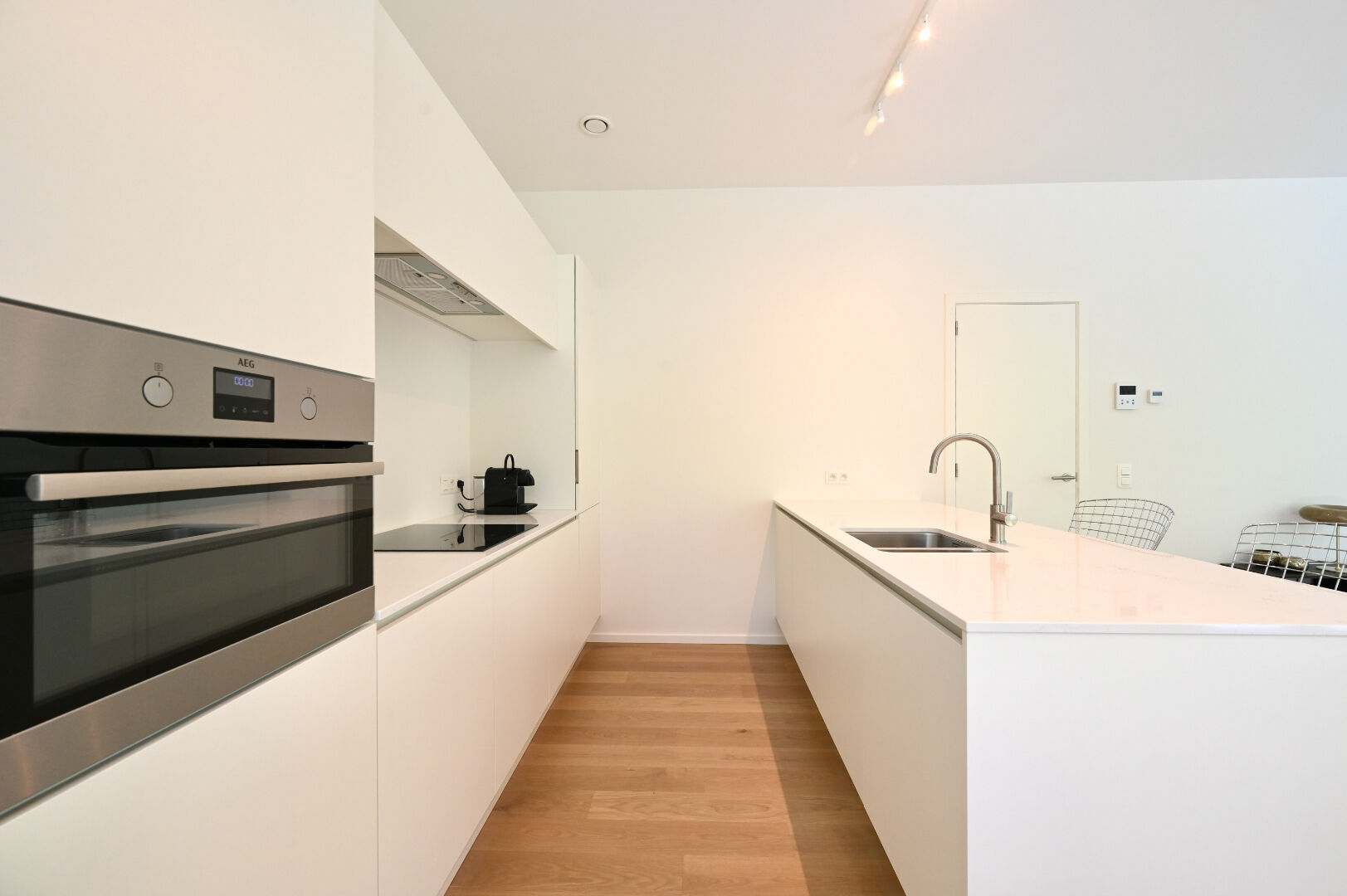 Het nieuwbouwappartement beschikt over een inkomhal met gastentoilet, een lichtrijke leef- en eetruimte met open keuken die rechtstreeks toegang biedt tot het zuidwestgericht terras van 10 m², twee praktische bergingen, één slaapkamer en een badkamer met inloopdouche en wastafel.