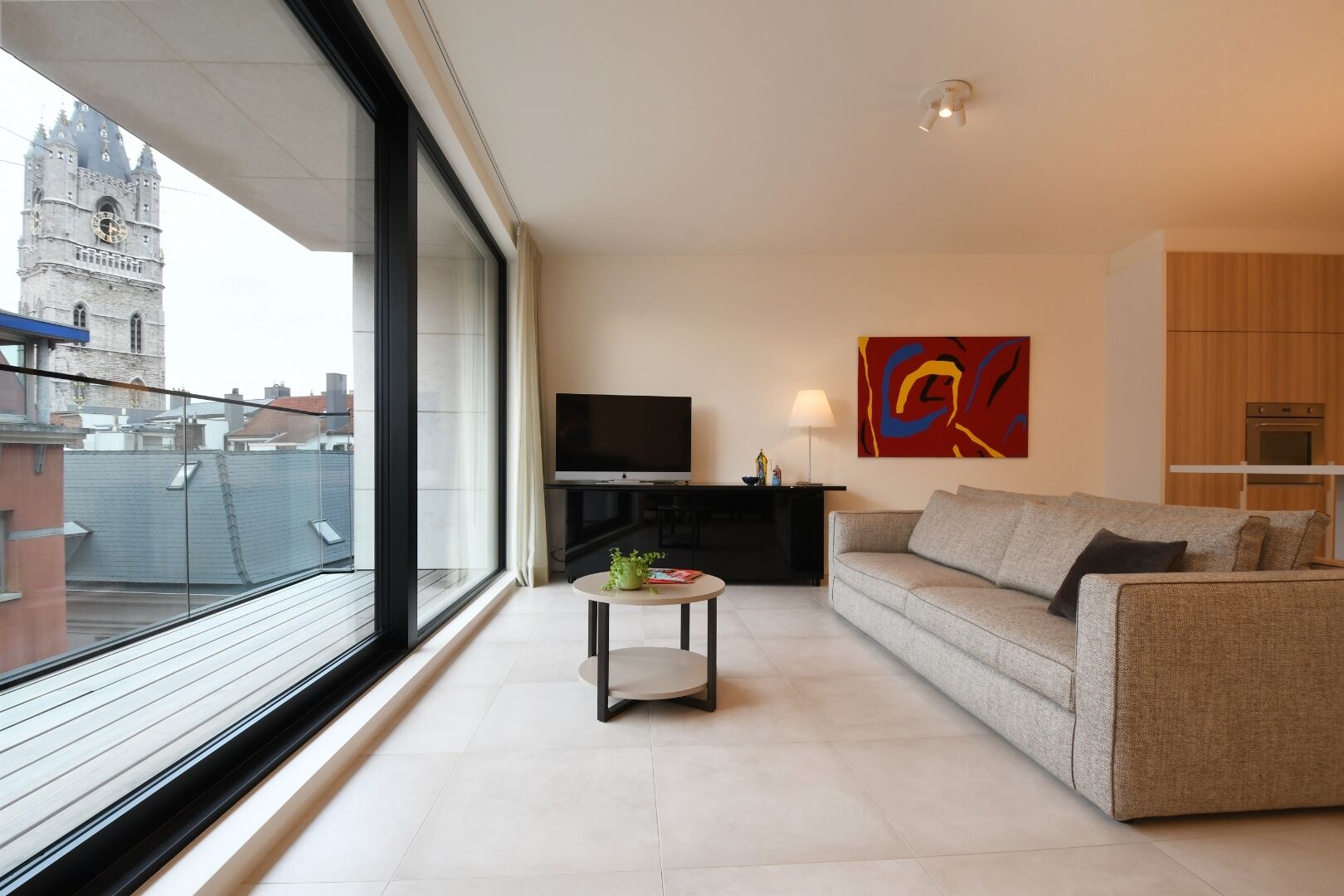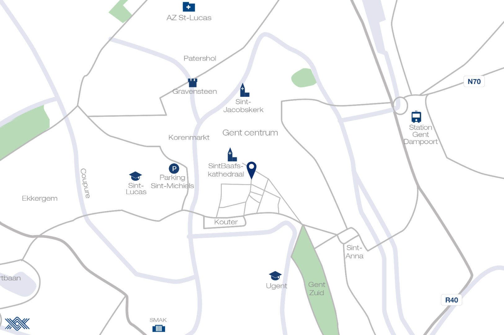 Dit appartement is gelegen op de vierde verdieping van de residentie ‘Plato’ en bevindt zich op een unieke locatie op één van de meest historische plaatsen van de Gentse binnenstad nabij het Sint-Baafsplein. In de onmiddellijke nabijheid is er een aantrekkelijk aanbod aan winkels, scholen, gastronomie, cultuur en recreatie allerhande. Ook het openbaar vervoer is goed voorzien met tram- en bushaltes op wandelafstand.