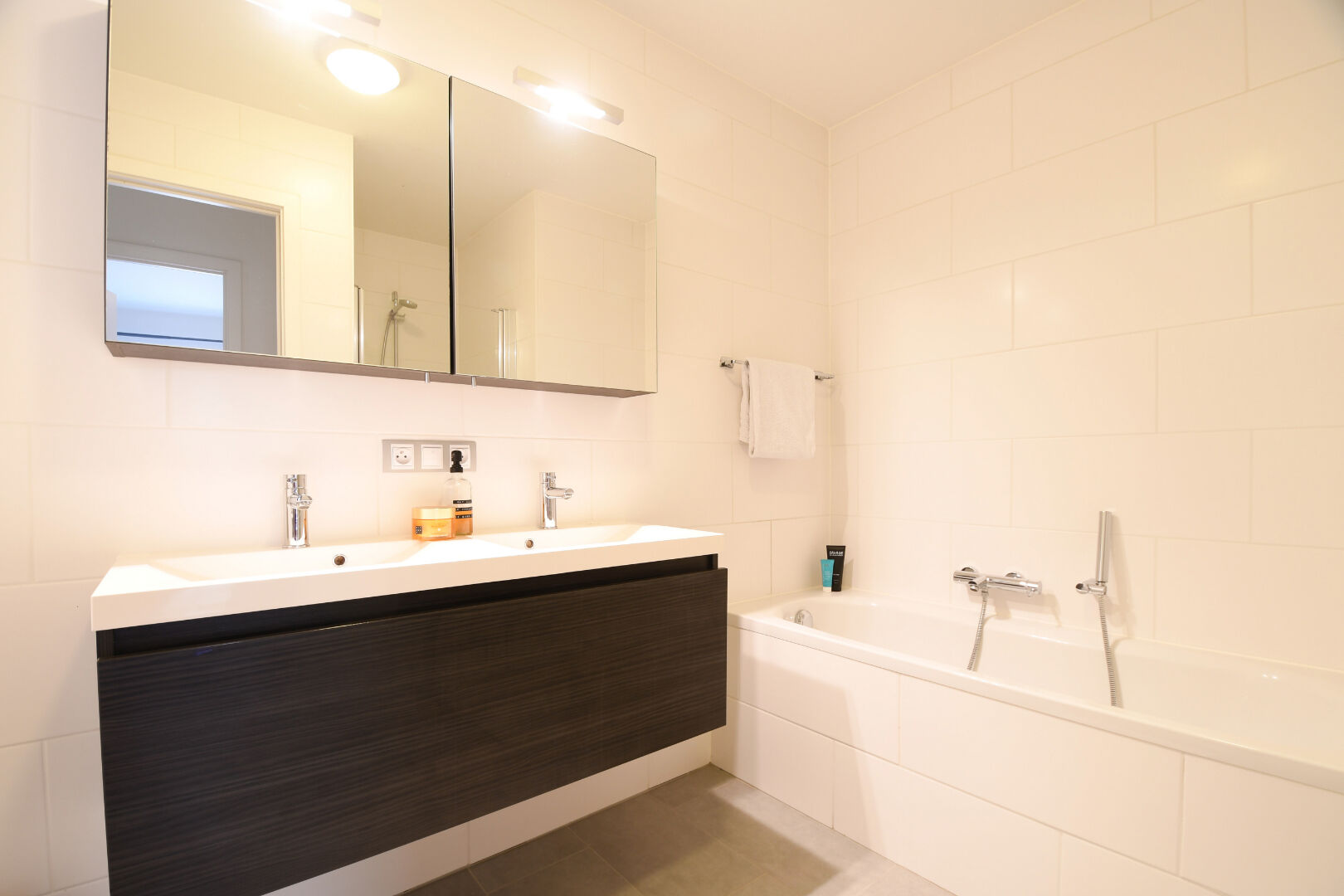 Het appartement beschikt over een inkomhal met een ingemaakte vestiaire kast en gastentoilet, een lichtrijke leefruimte voorzien van een eiken parket, een geïnstalleerde open keuken met annex een praktische berging, een badkamer met ligbad en instapdouche, twee slaapkamers en een ruim terras.
