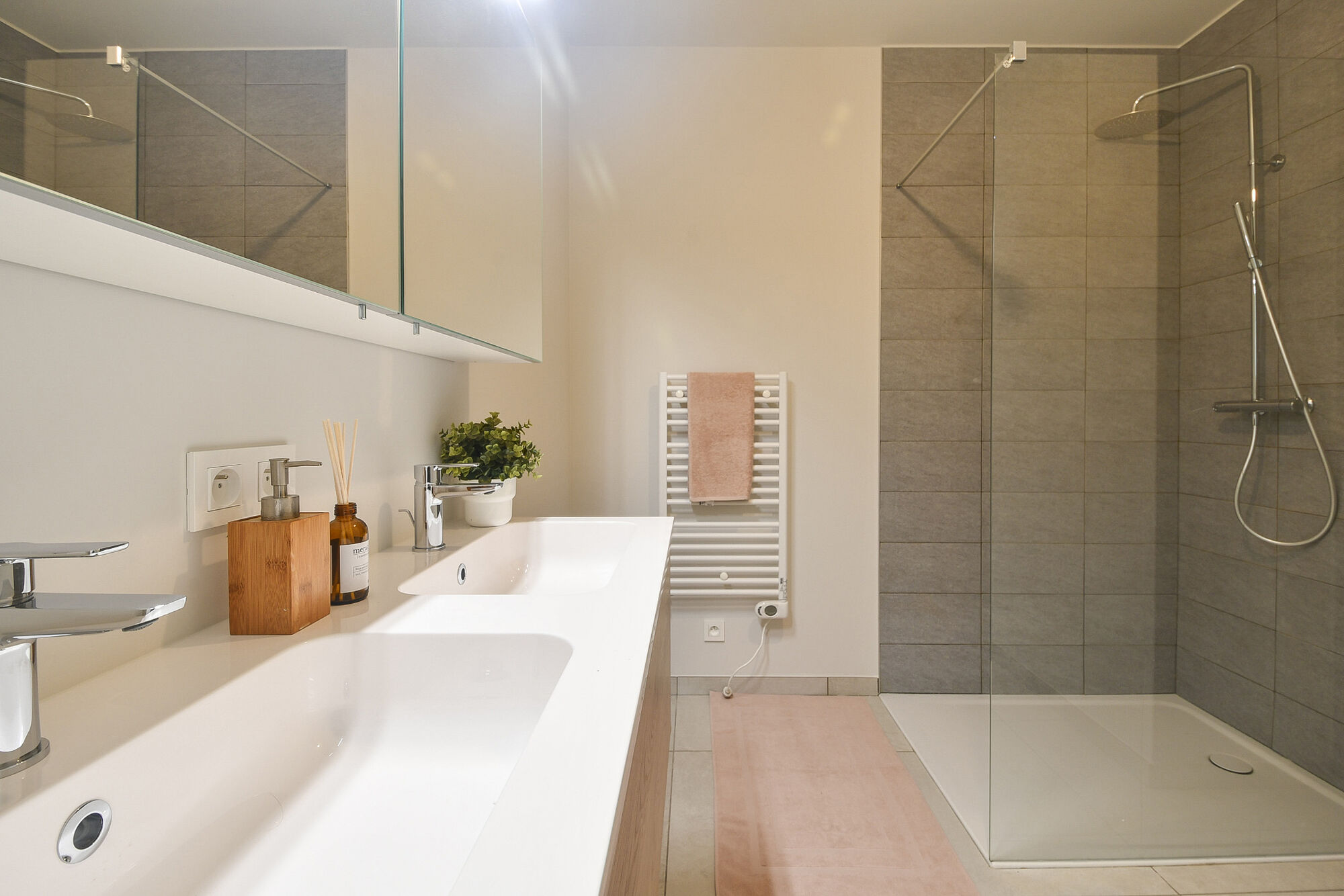 Dit ruime gelijkvloers appartement met een bewoonbare oppervlakte van 116 m² maakt deel uit van de residentie Zwitsers Hof in Melle. De indeling is als volgt: via de inkomhal met gastentoilet bereikt u de lichtrijke leef- en eetruimte met open keuken volledig uitgerust met hoogwaardige inbouwtoestellen. De leefruimte geeft rechtstreeks uit op het ruime zonneterras van 26 m². Daarnaast beschikt het appartement over een praktische berging, twee slaapkamers met toegang tot een tweede terras van 20 m² en twee badkamers waarvan één met dubbele wastafel en inloopdouche en een tweede met inloopdouche en lavabo.