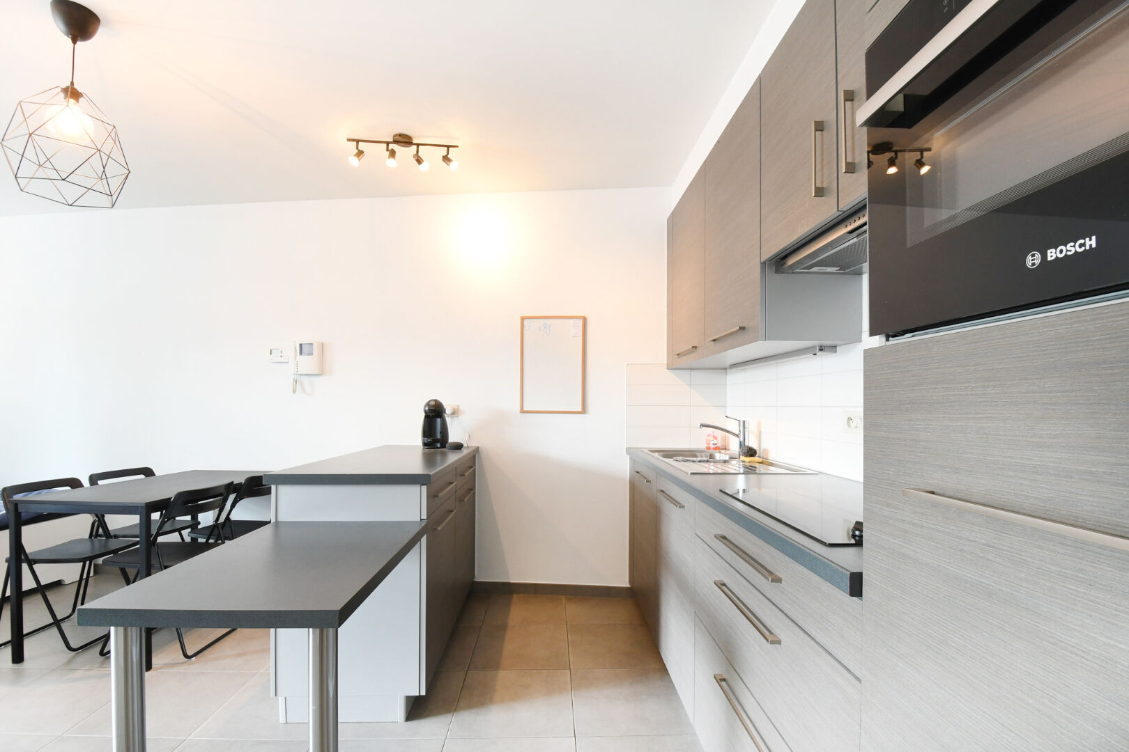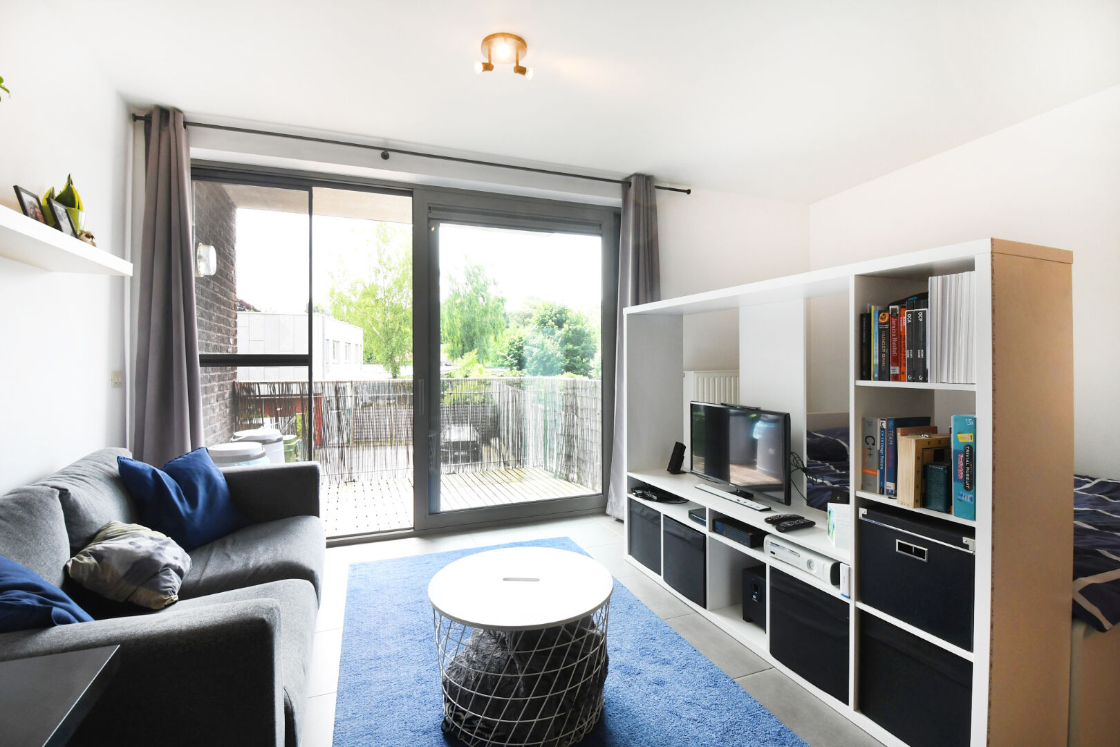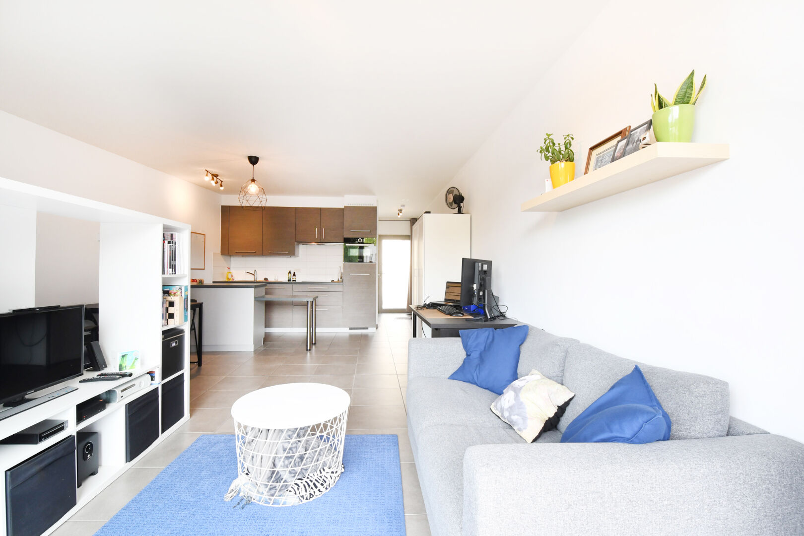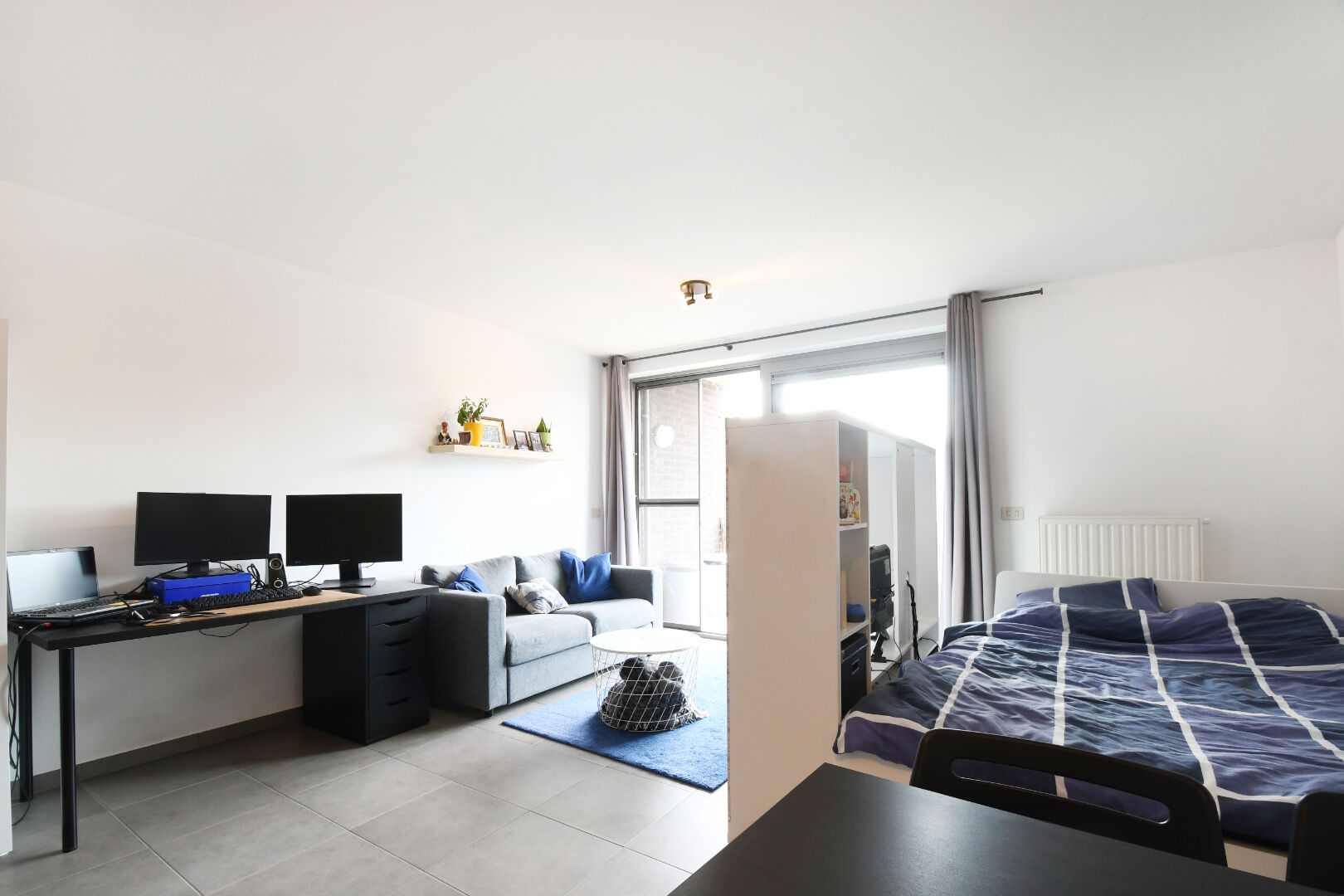 De studio is ingedeeld als volgt: een inkomhal, een badkamer met lavabomeubel, douche en toilet, een praktische bergruimte en een lichtrijke leefruimte met open keuken. Via het schuifraam in de leefruimte bereikt u het zuidwestelijk georiënteerd terras. De autostaanplaats in inbegrepen in de huurprijs.