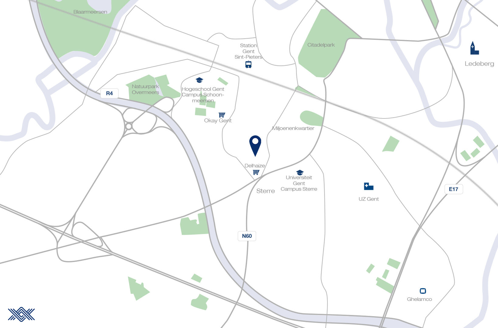 Uitstekend bereikbaar met tram, bus en fiets. Snelle toegang tot E40 en R4, en op enkele minuten van het station Gent-Sint-Pieters.