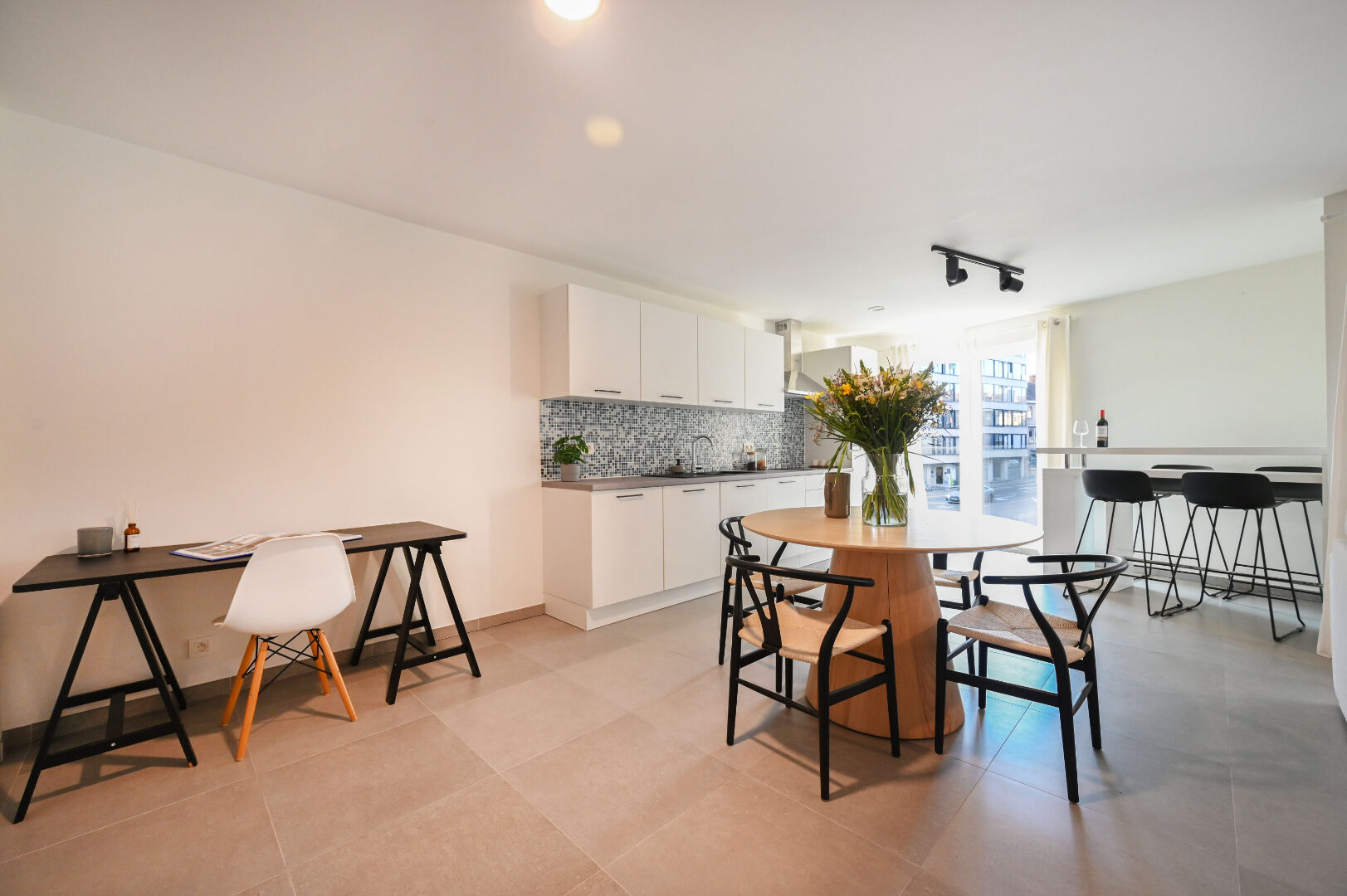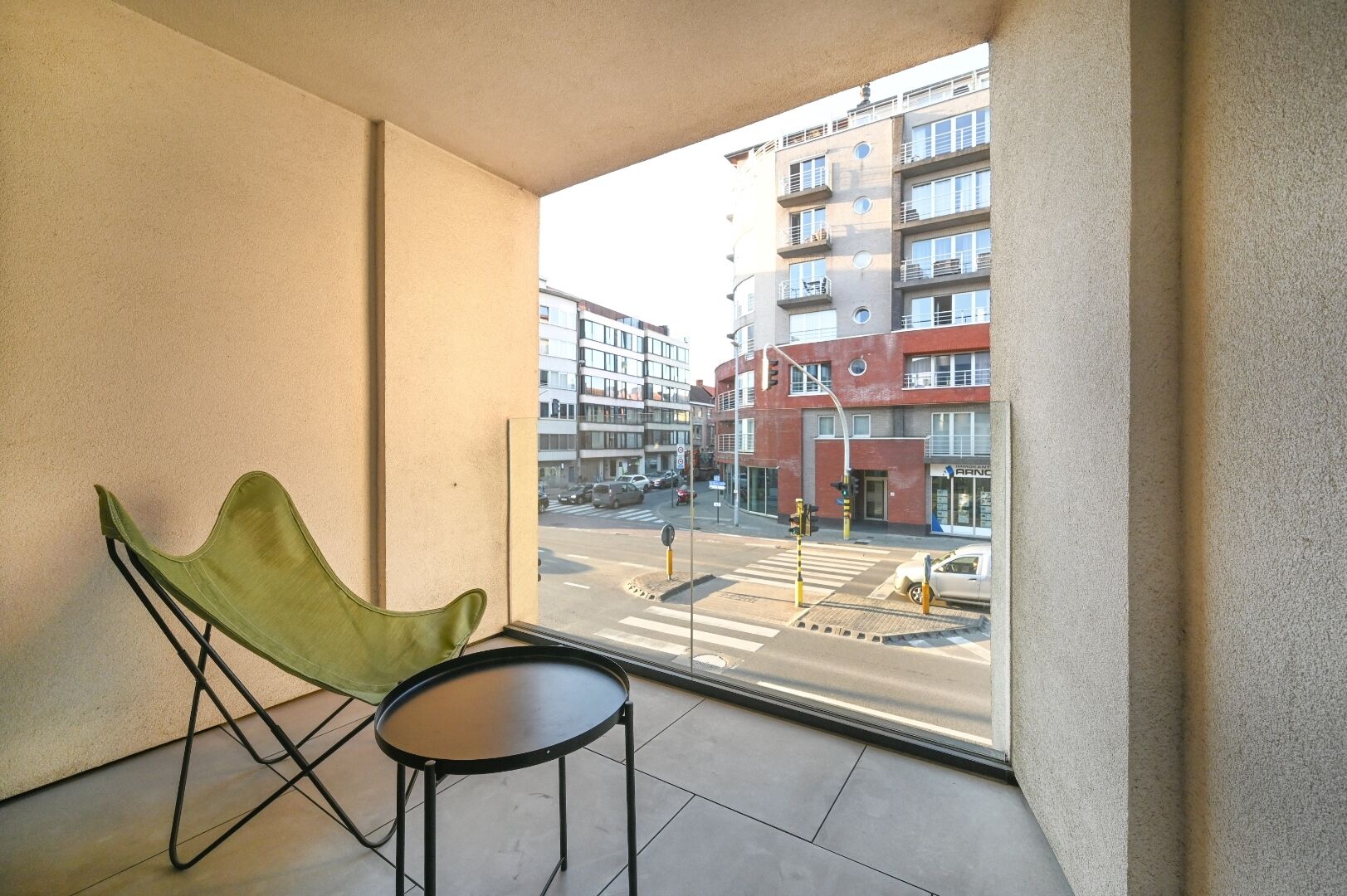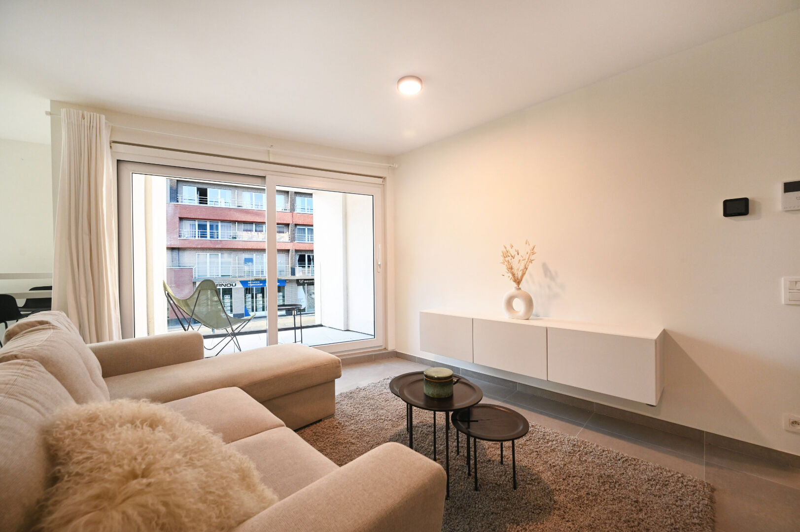 Bij het betreden van het appartement kom je in een inkomhal die toegang biedt tot alle andere vertrekken. De lichtrijke leefruimte vormt het hart van het appartement en sluit aan op een open keuken met eetplaats. Vanuit de leefruimte bereik je het terras dat voldoende ruimte biedt om een sfeervolle buitenhoek te creëren.