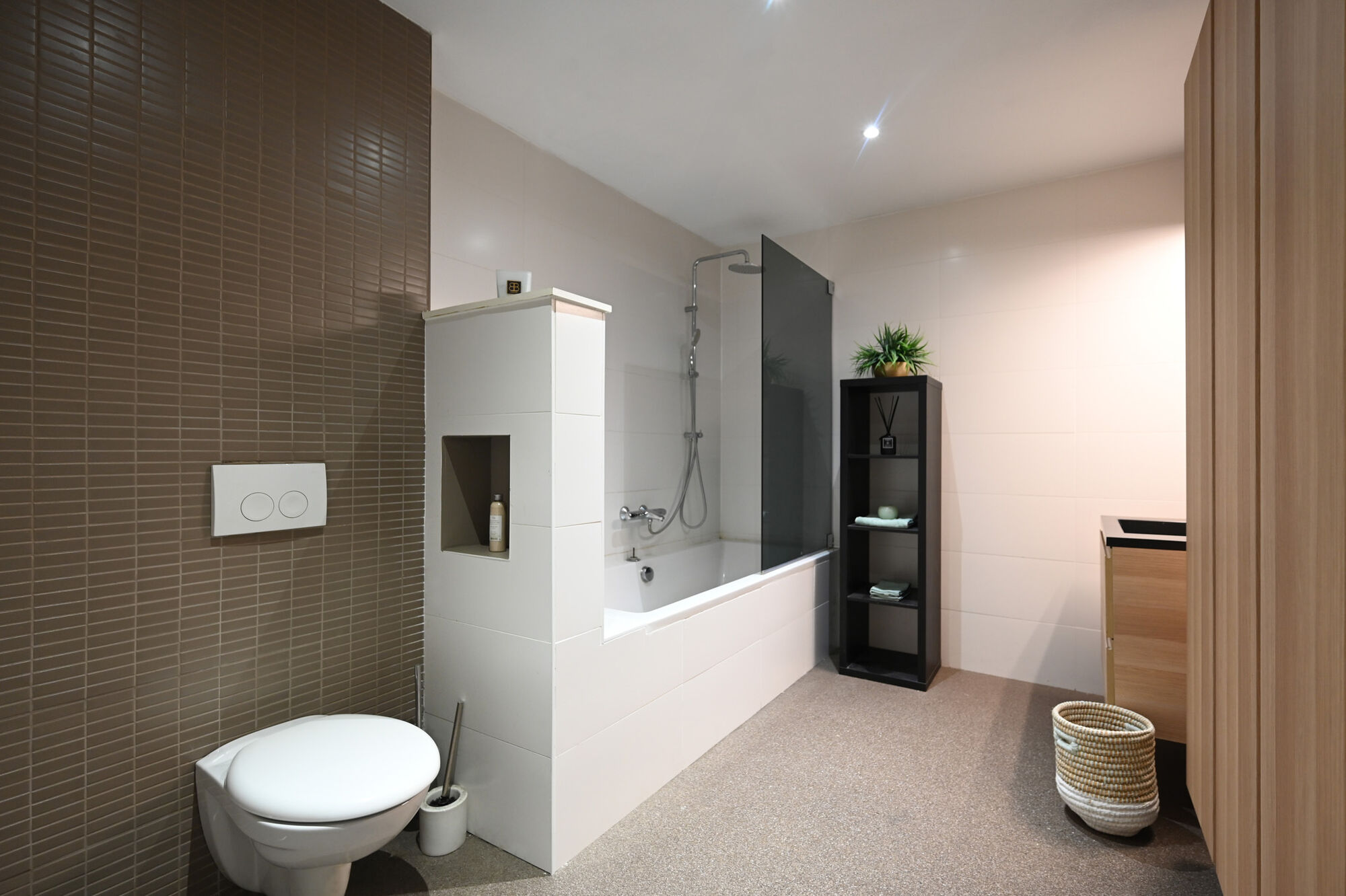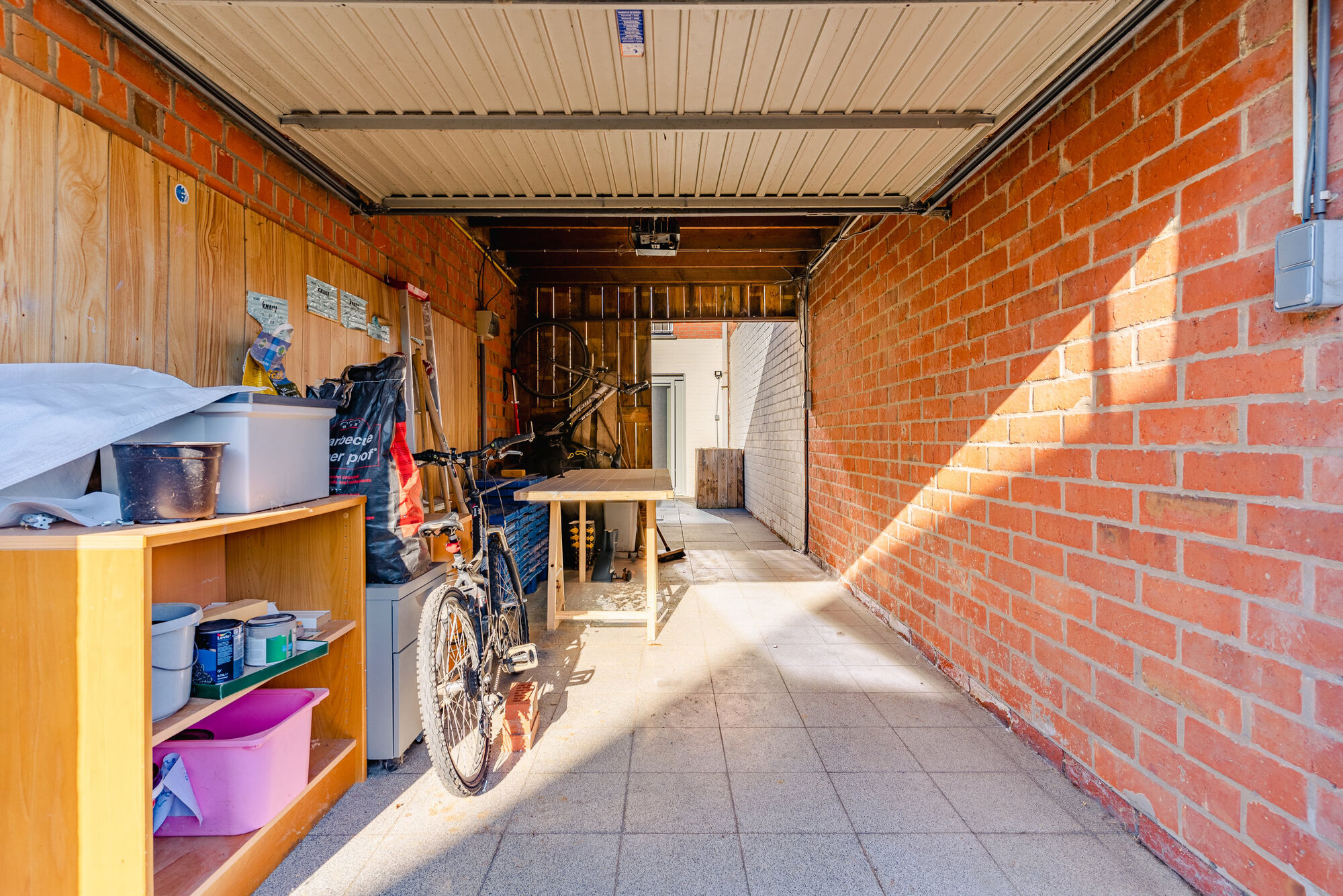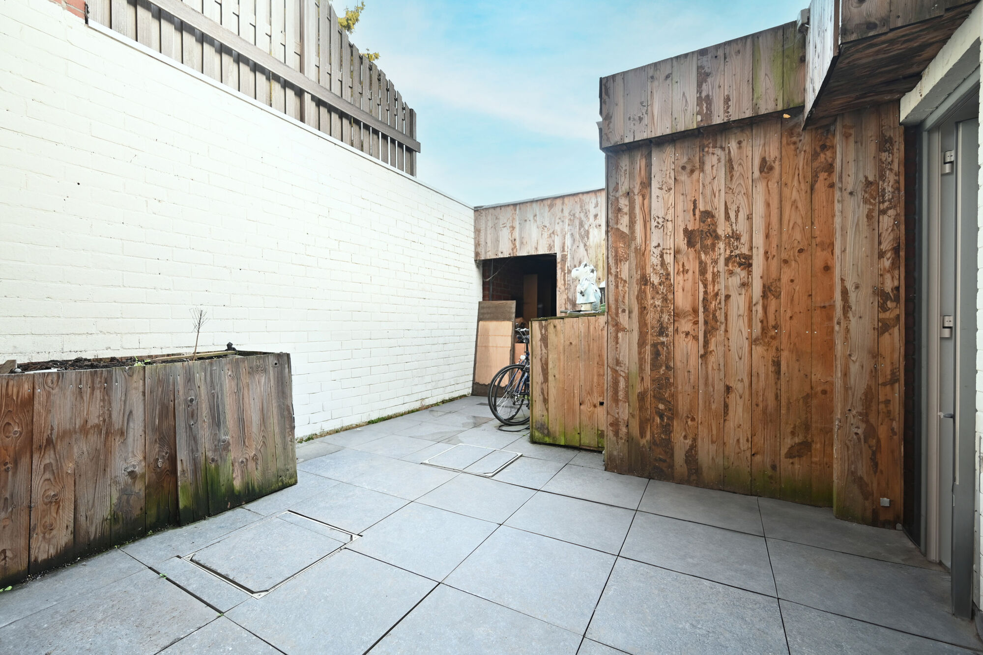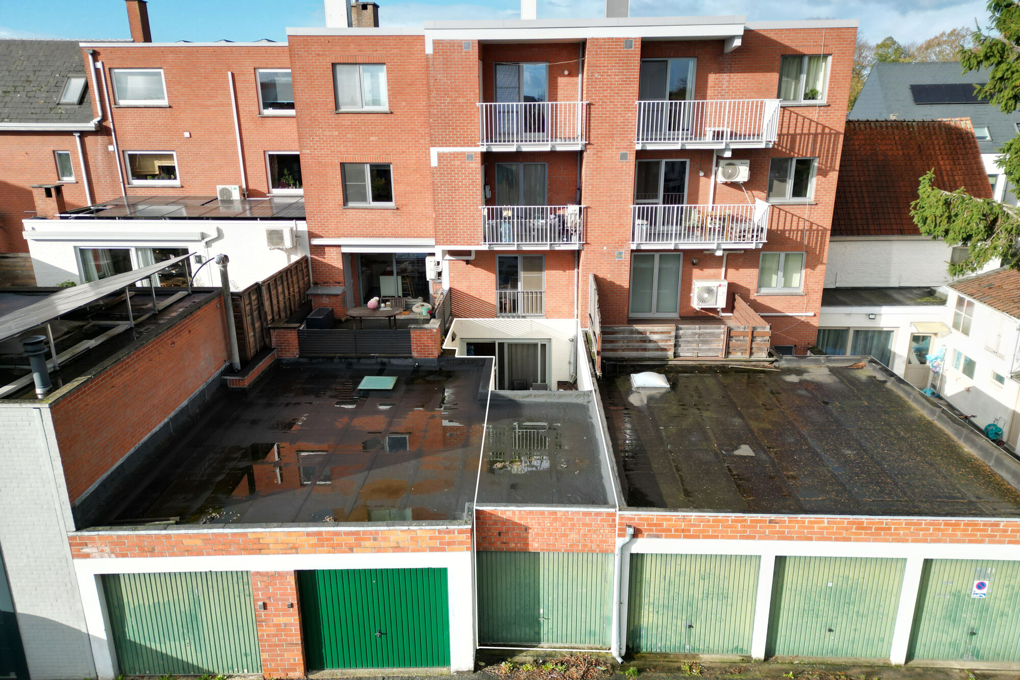 Buiten beschikt dit appartement over een ruime stadskoer met oostelijke oriëntatie die directe toegang biedt aan de garagebox, wat zorgt voor veilige en praktische parking.