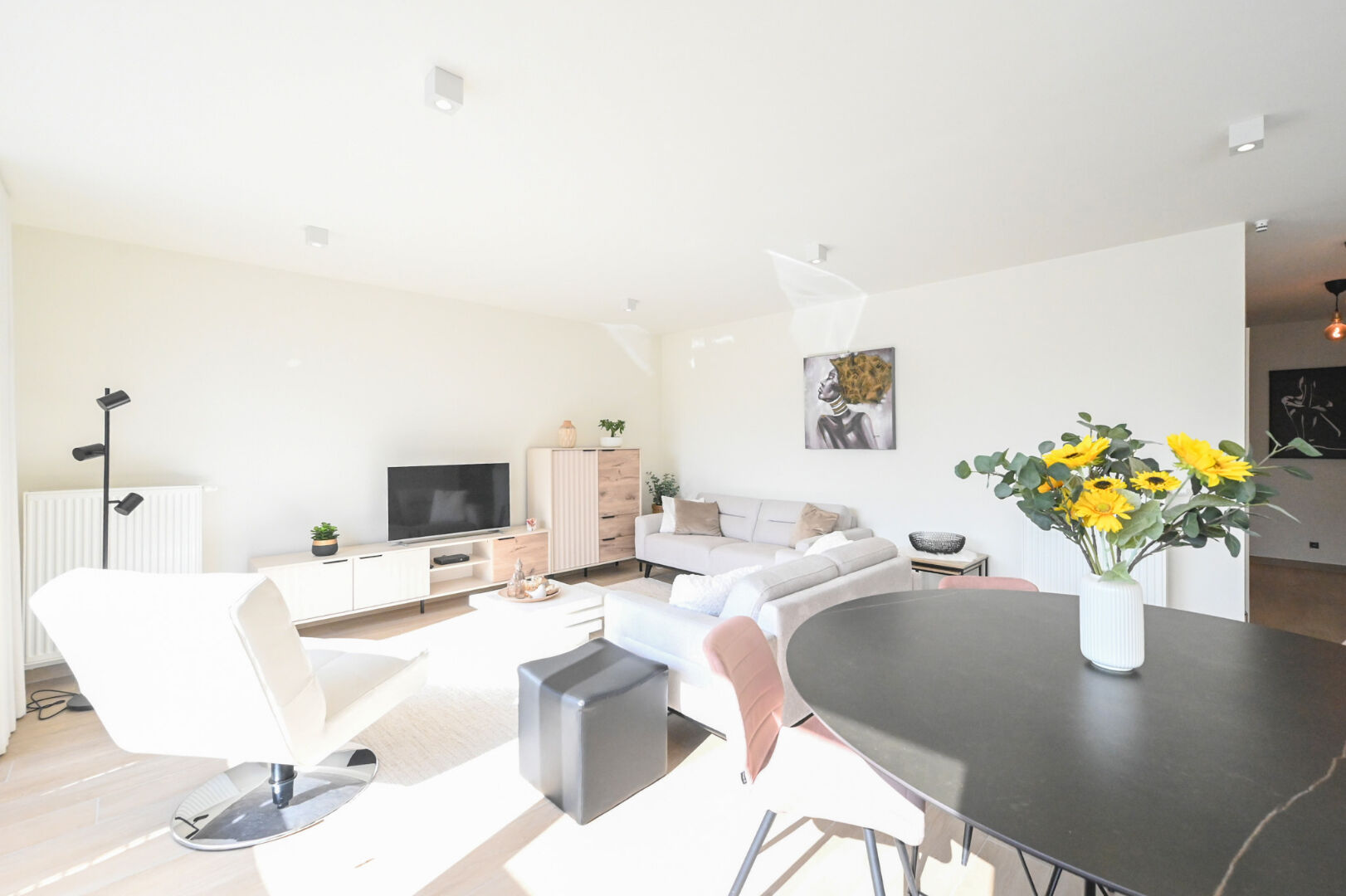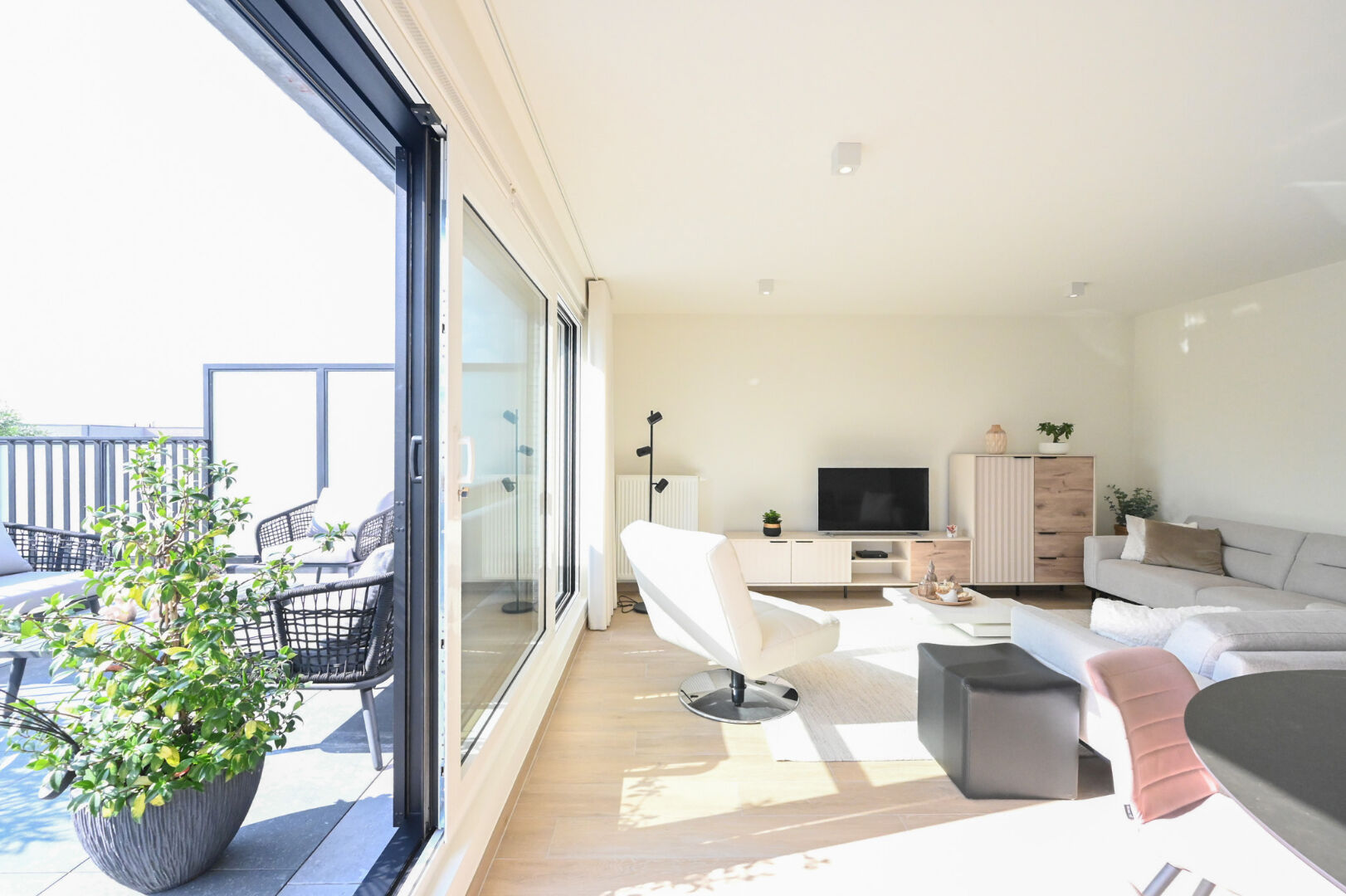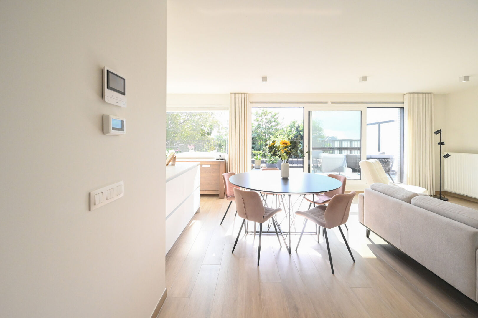 Via de inkomhal met gastentoilet komt u in de ruime en lichtrijke leefruimte, waar grote ramen zorgen voor een aangename sfeer en directe toegang bieden tot het zuidgerichte terras met zicht op de gemeenschappelijke tuin. Dankzij de zonneluifel geniet u hier het hele jaar door van een perfect evenwicht tussen zon en schaduw.
