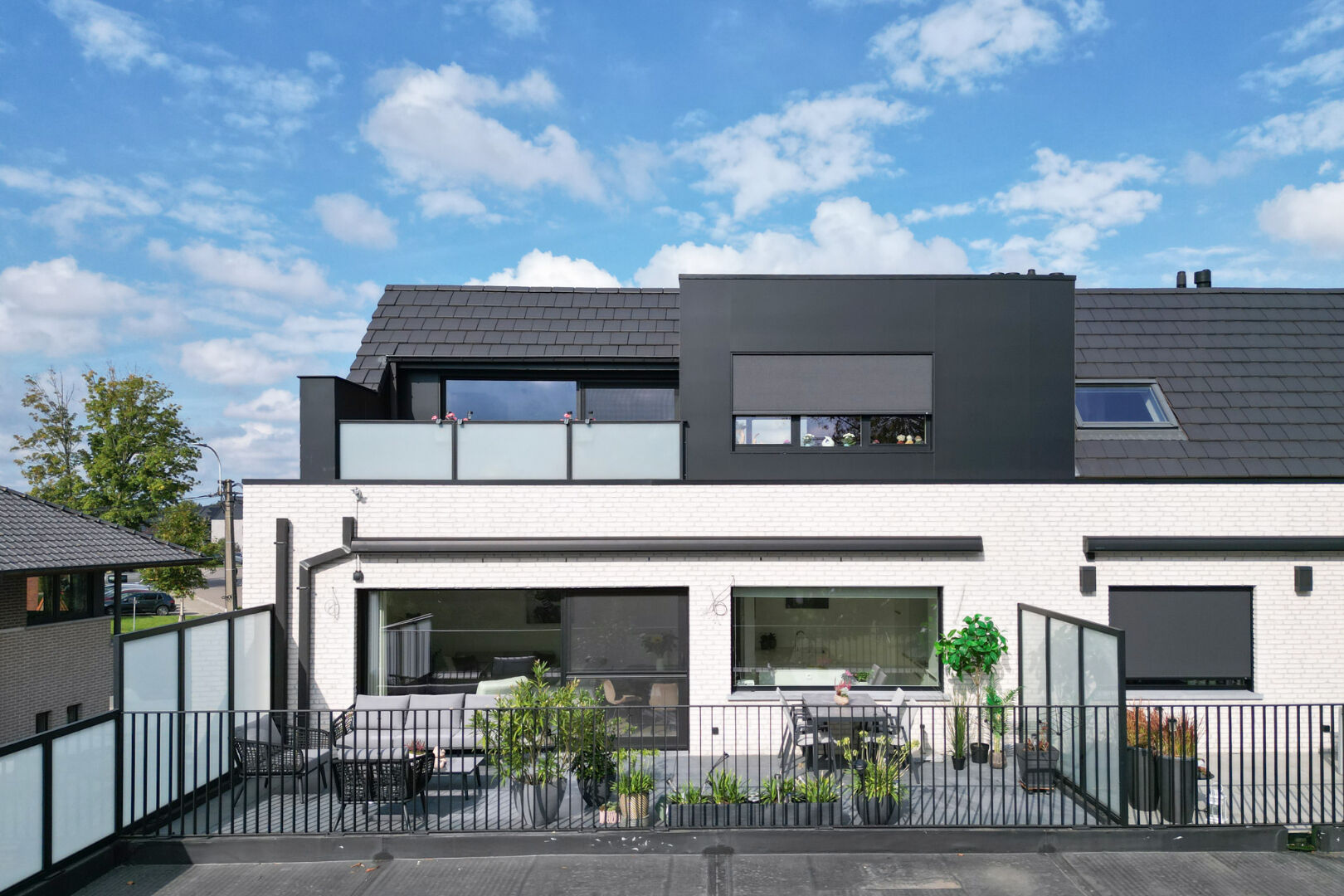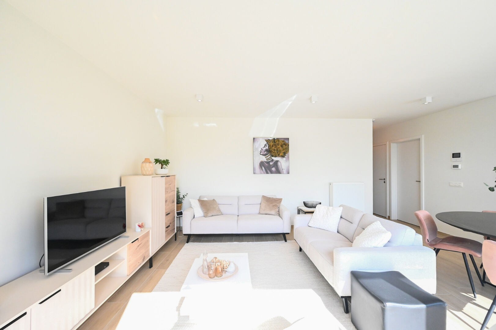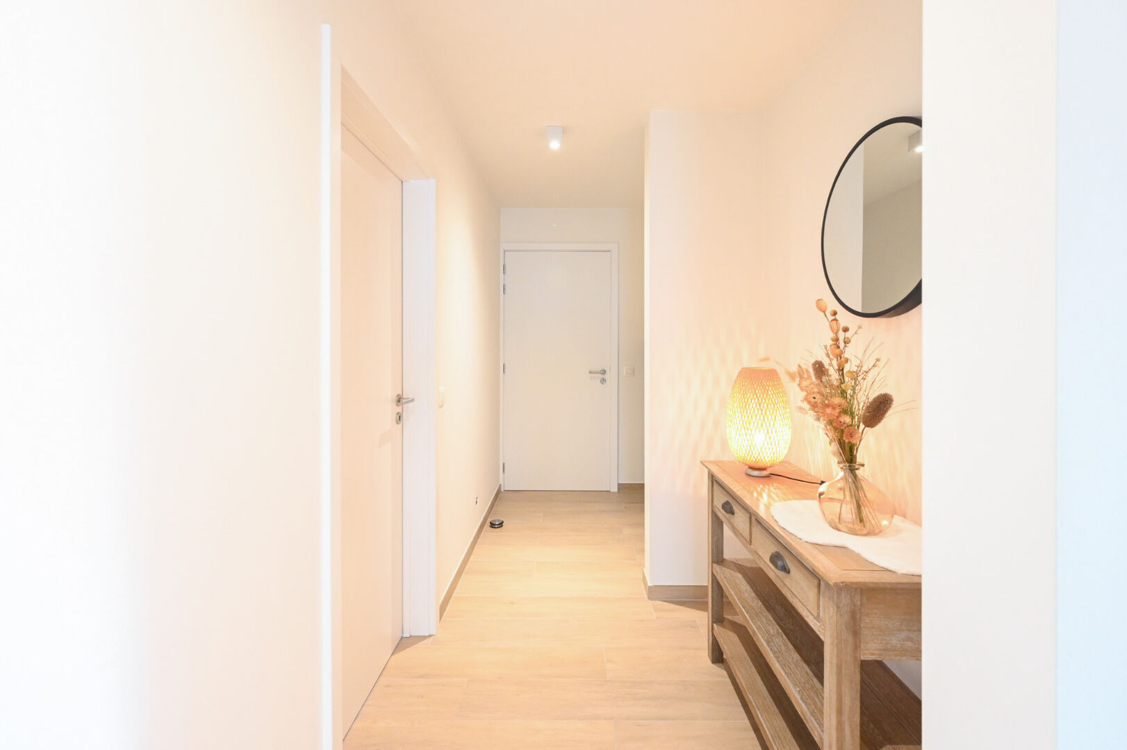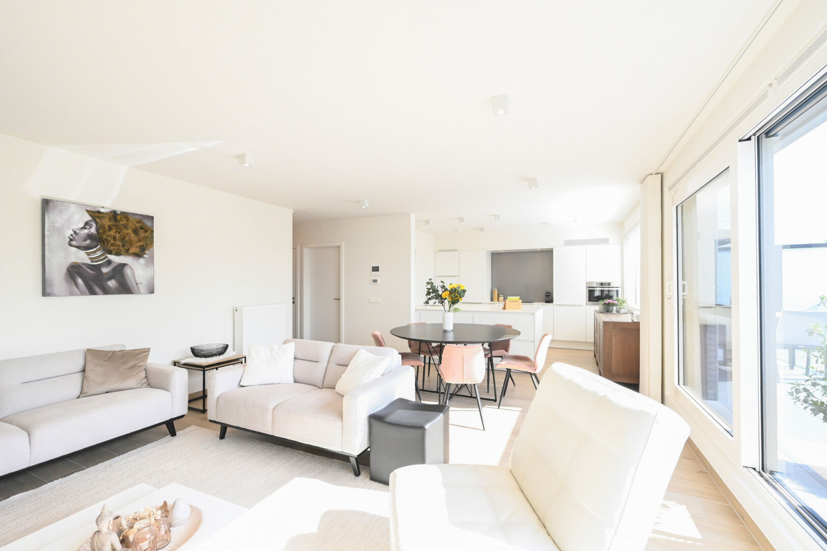 Via de inkomhal met gastentoilet komt u in de ruime en lichtrijke leefruimte, waar grote ramen zorgen voor een aangename sfeer en directe toegang bieden tot het zuidgerichte terras met zicht op de gemeenschappelijke tuin. Dankzij de zonneluifel geniet u hier het hele jaar door van een perfect evenwicht tussen zon en schaduw.