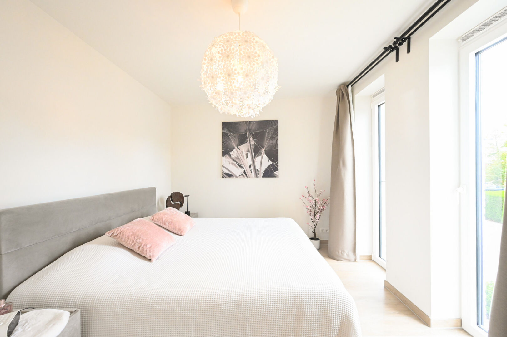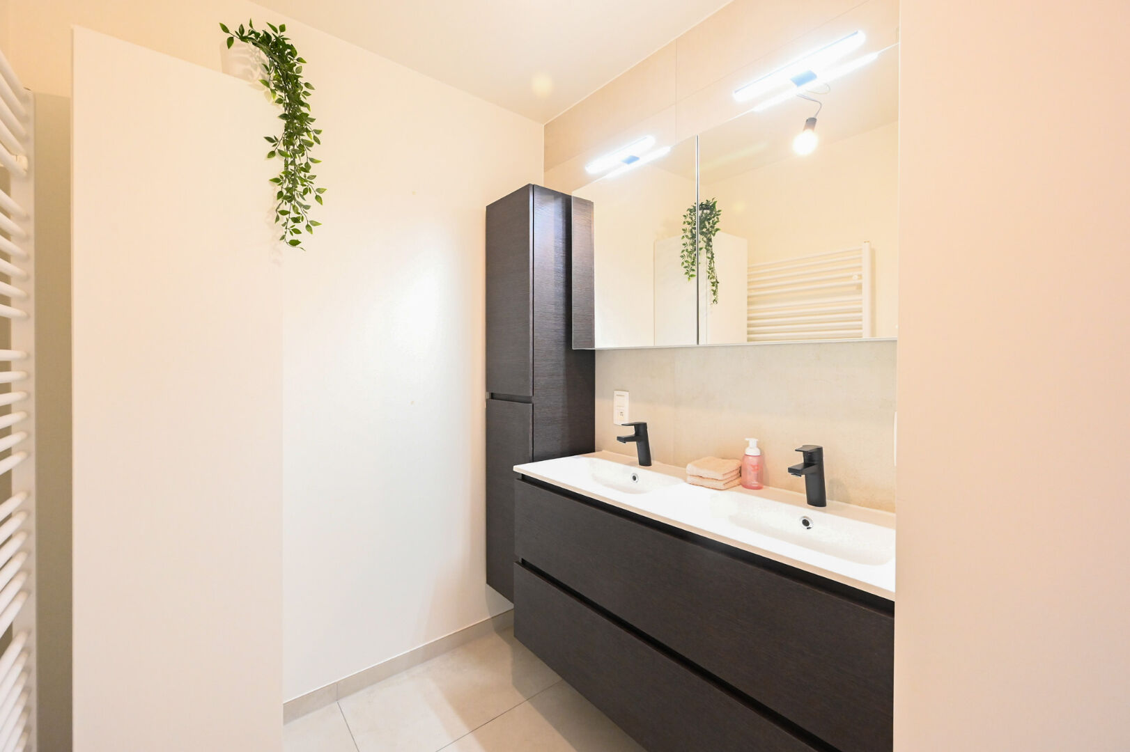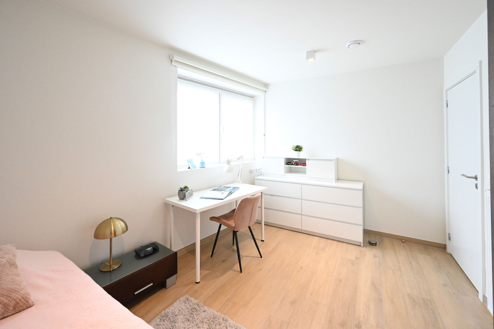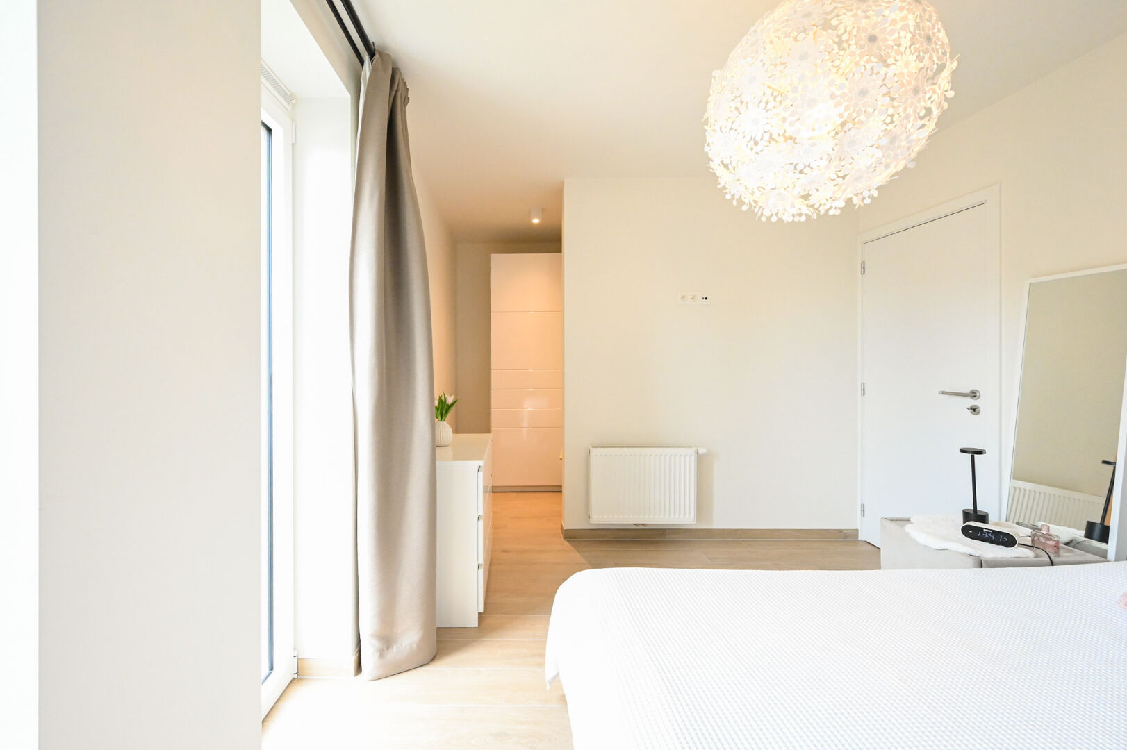 Het appartement beschikt over drie volwaardige slaapkamers, waaronder één met aparte dressing. De stijlvolle badkamer is uitgerust met een inloopdouche en dubbele wastafel, uitgevoerd met duurzame materialen.