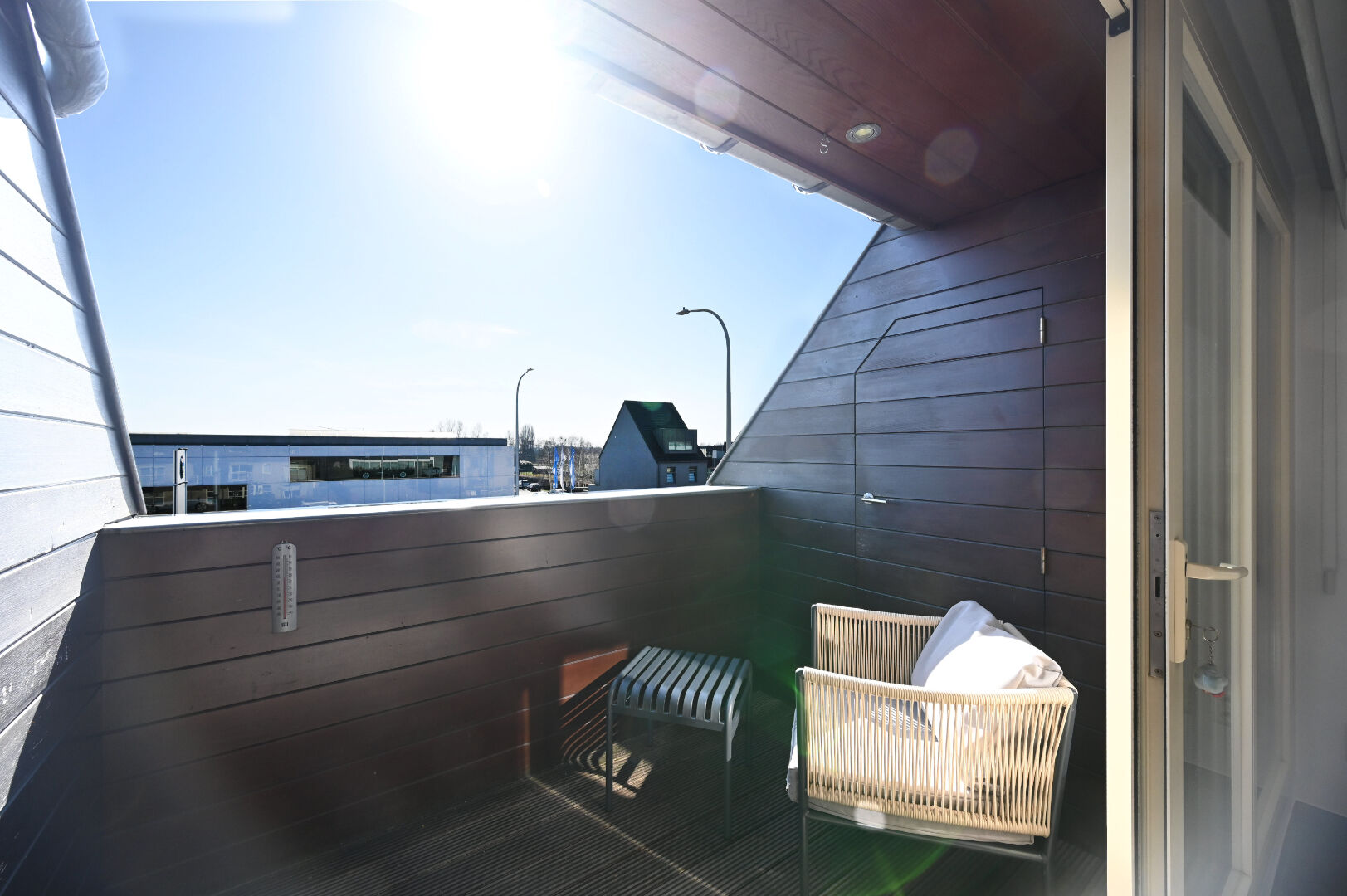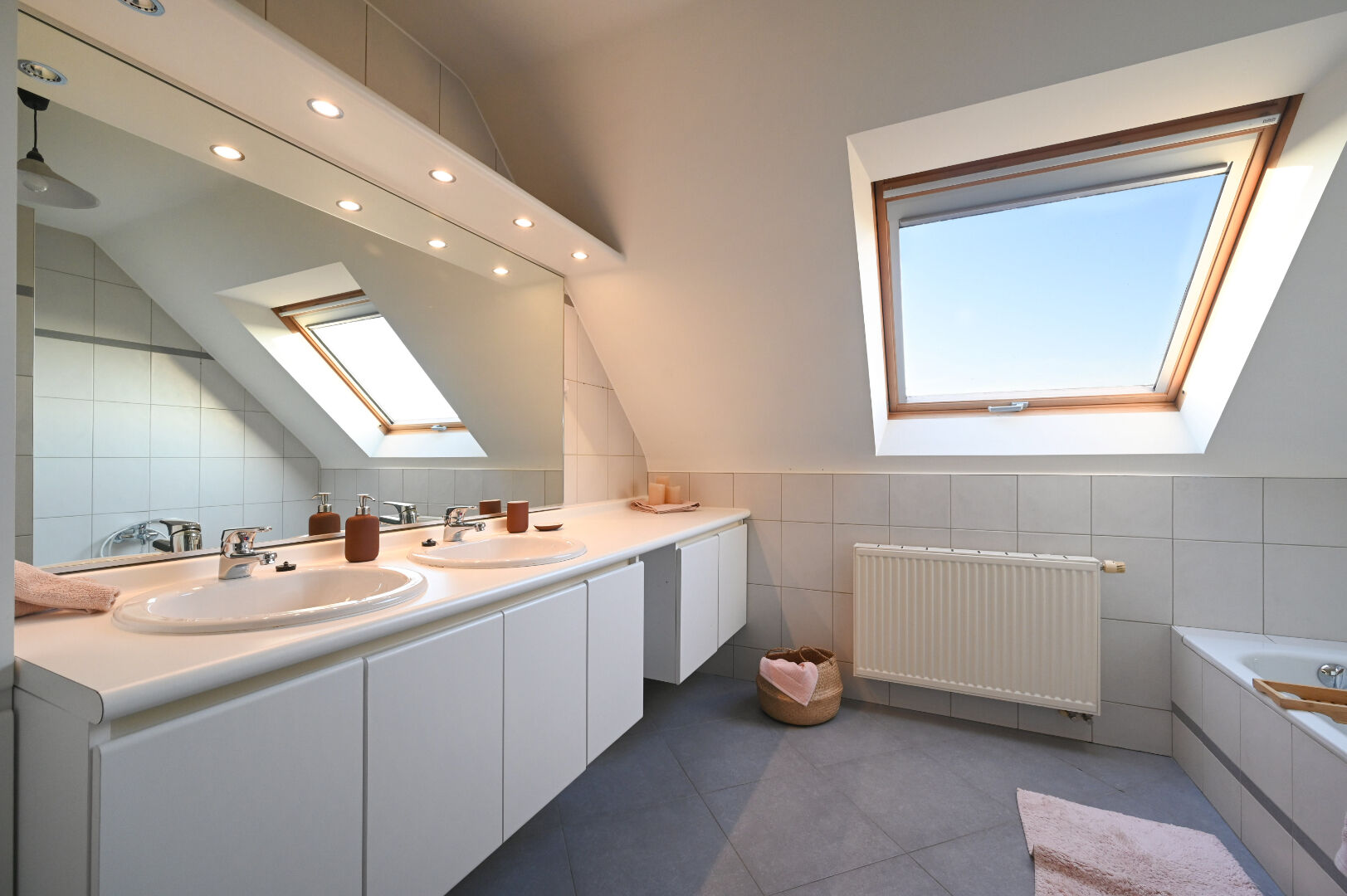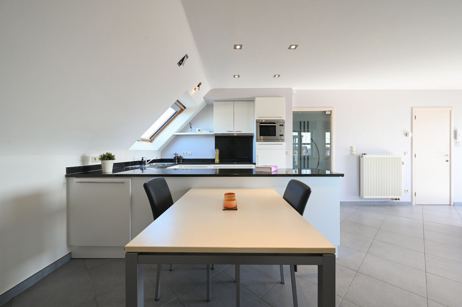 Bij binnenkomst kom je in een ruime hal die leidt naar een open en lichte leefruimte, die door grote raampartijen badend in natuurlijk licht wordt ondergedompeld. Aangrenzend ligt een zuidgericht terras, ideaal om de hele dag door van de zon te genieten. De open keuken is volledig uitgerust met moderne toestellen, wat koken tot een aangename ervaring maakt.