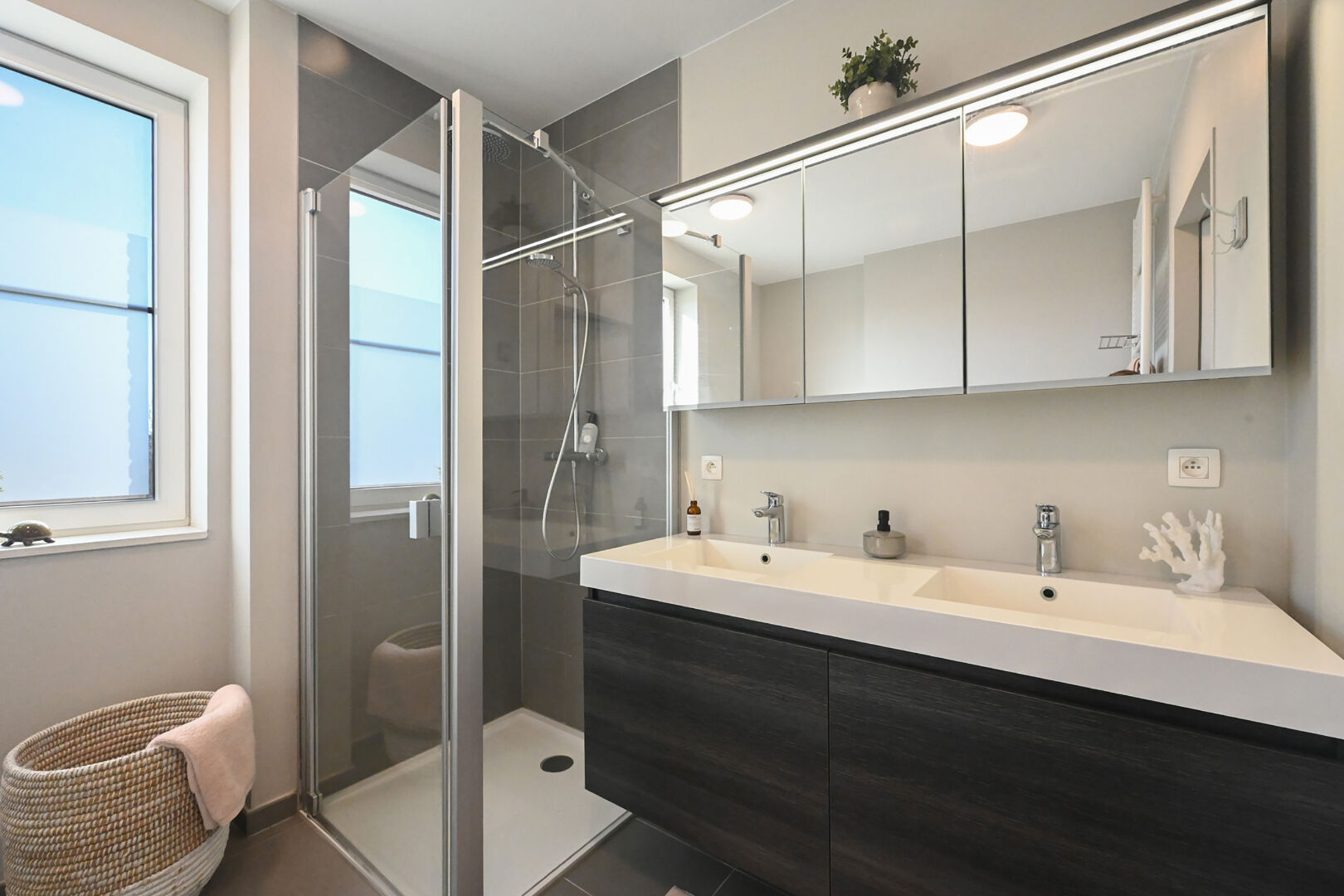 Het ruime tweeslaapkamerappartement heeft een bewoonbare oppervlakte van 105 m2 en biedt een zonnig zuidwestelijk gericht terras van maar liefst 41 m2. De indeling is als volgt: een inkomhal, een lichtrijke leefruimte ingedeeld in een eet- en zitplaats met rechtstreekse toegang tot het terras en een open keuken. Hier bevindt zich eveneens een technische berging. Via de nachthal heeft men toegang tot de twee slaapkamers die beiden zijn uitgerust met ingemaakte kasten, de badkamer voorzien van een ligbad, een inloopdouche, een dubbele wastafel en een toilet. In deze nachthal bevindt zich eveneens een gastentoilet.