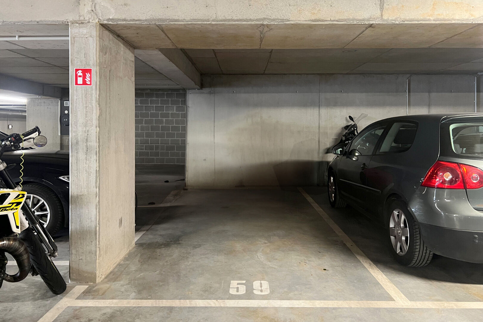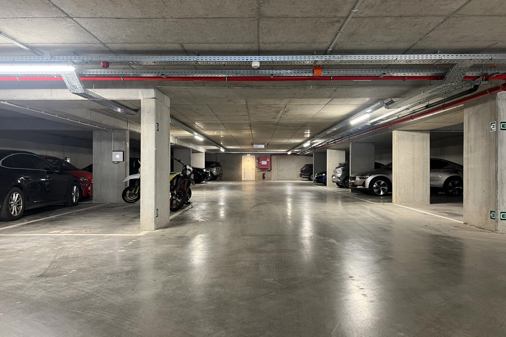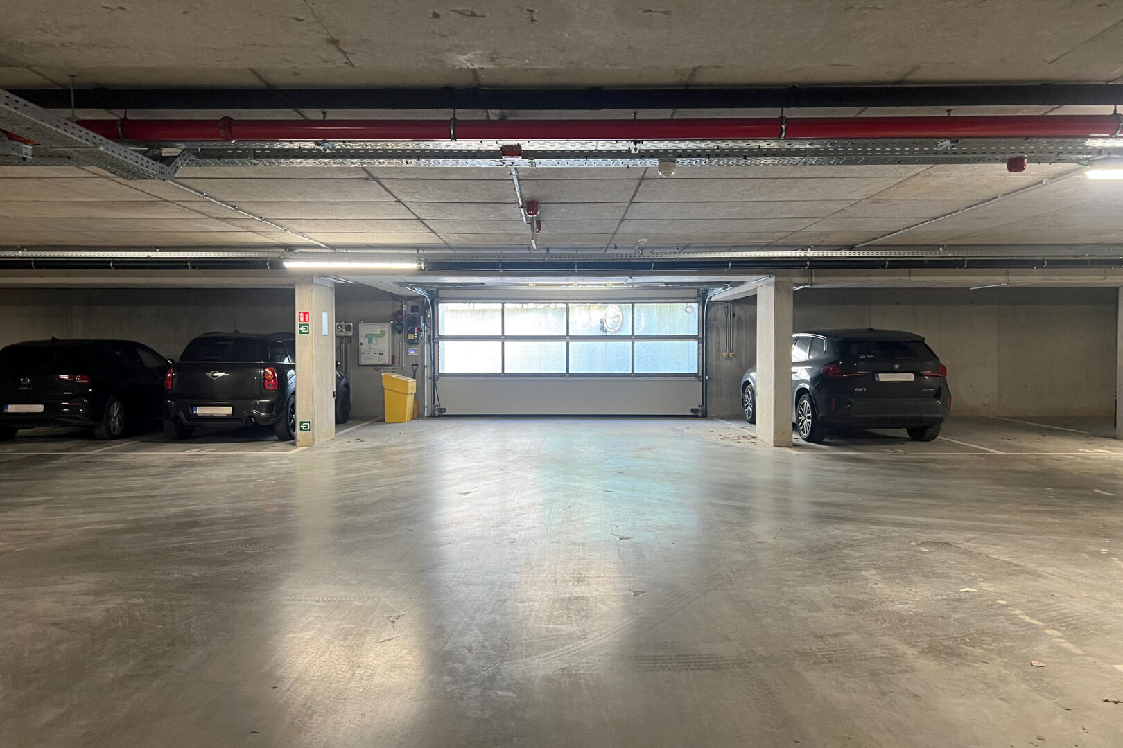 De staanplaats van 2,25m op 5,50m biedt een veilige stalplaats voor uw wagen, dankzij de automatische, afgesloten sectionaalpoort naar de ondergrondse verdieping. De inrit is praktisch en extra breed.