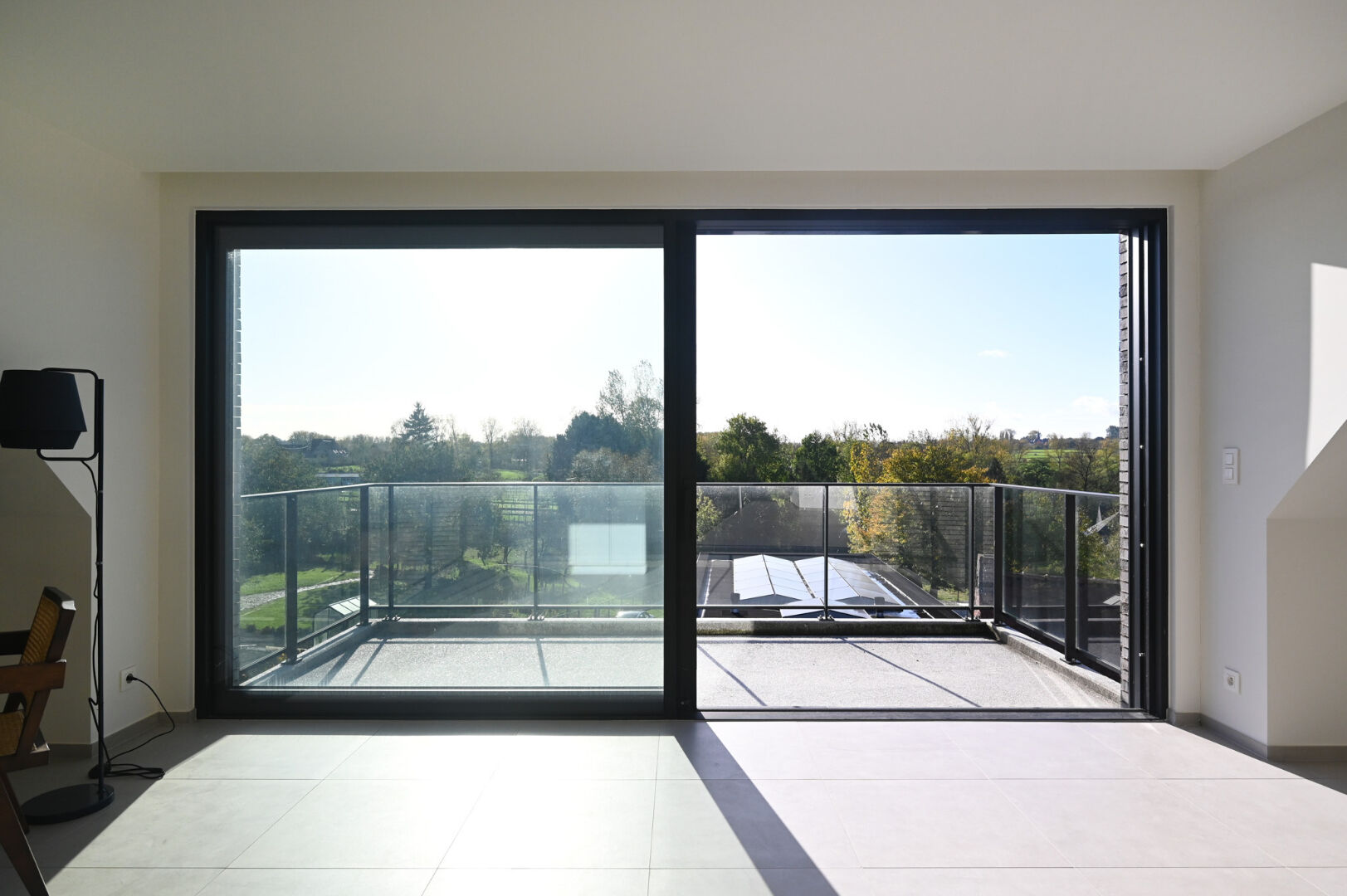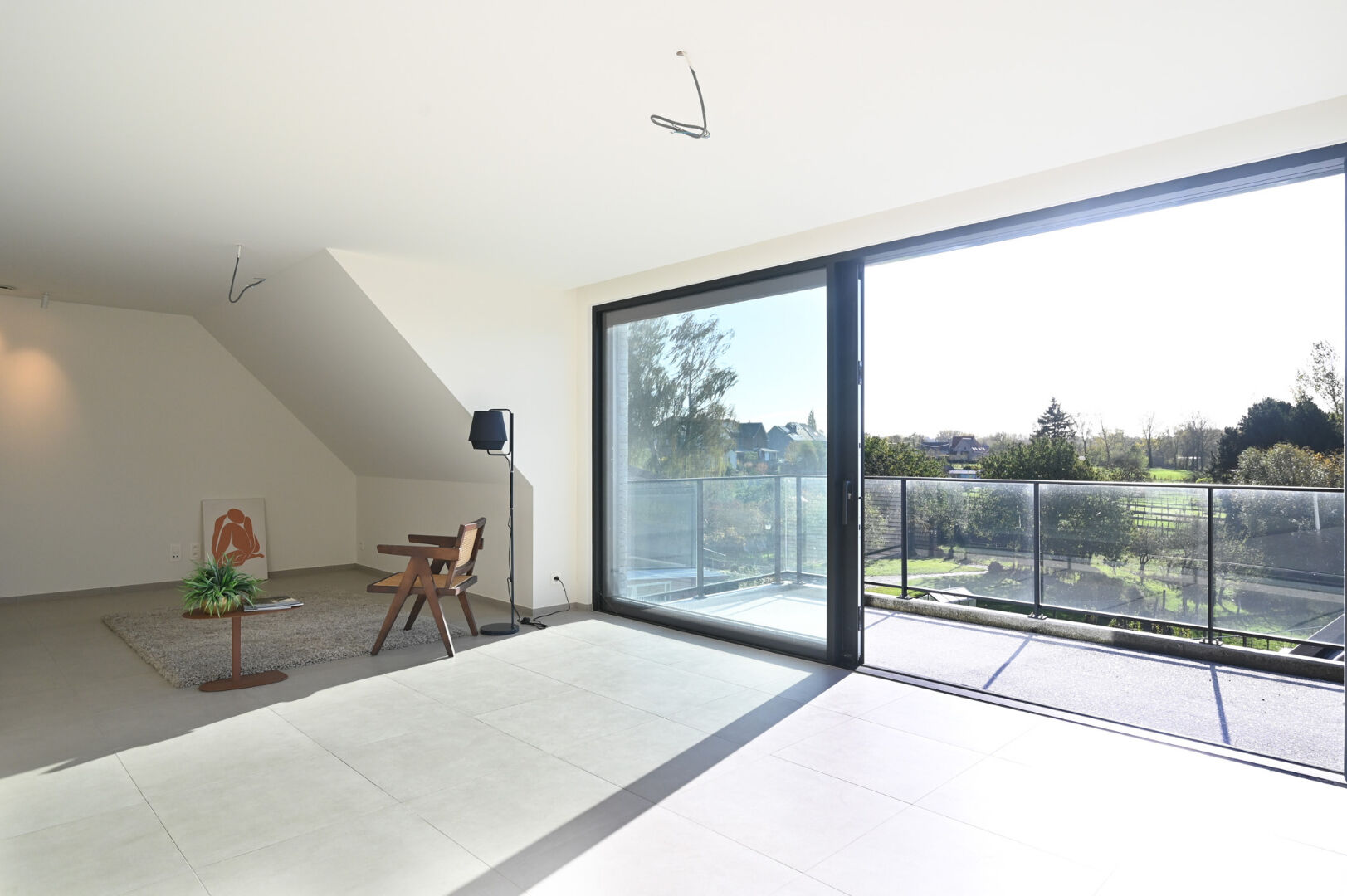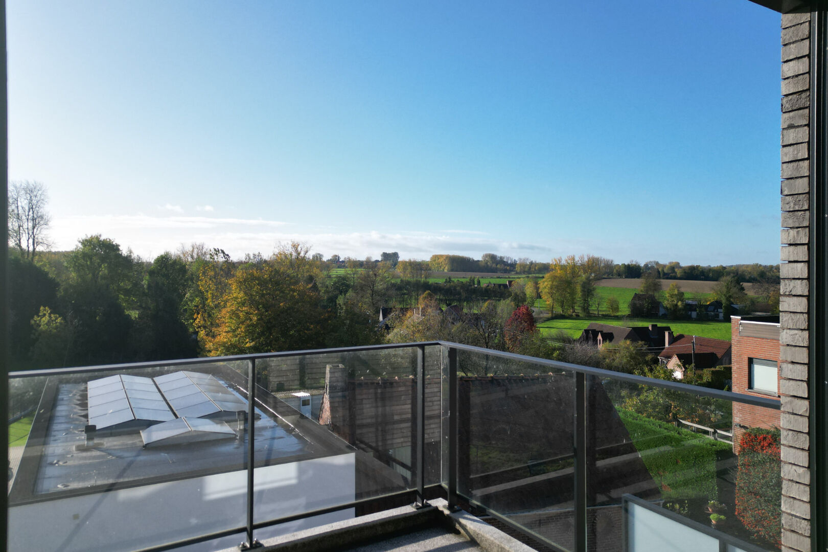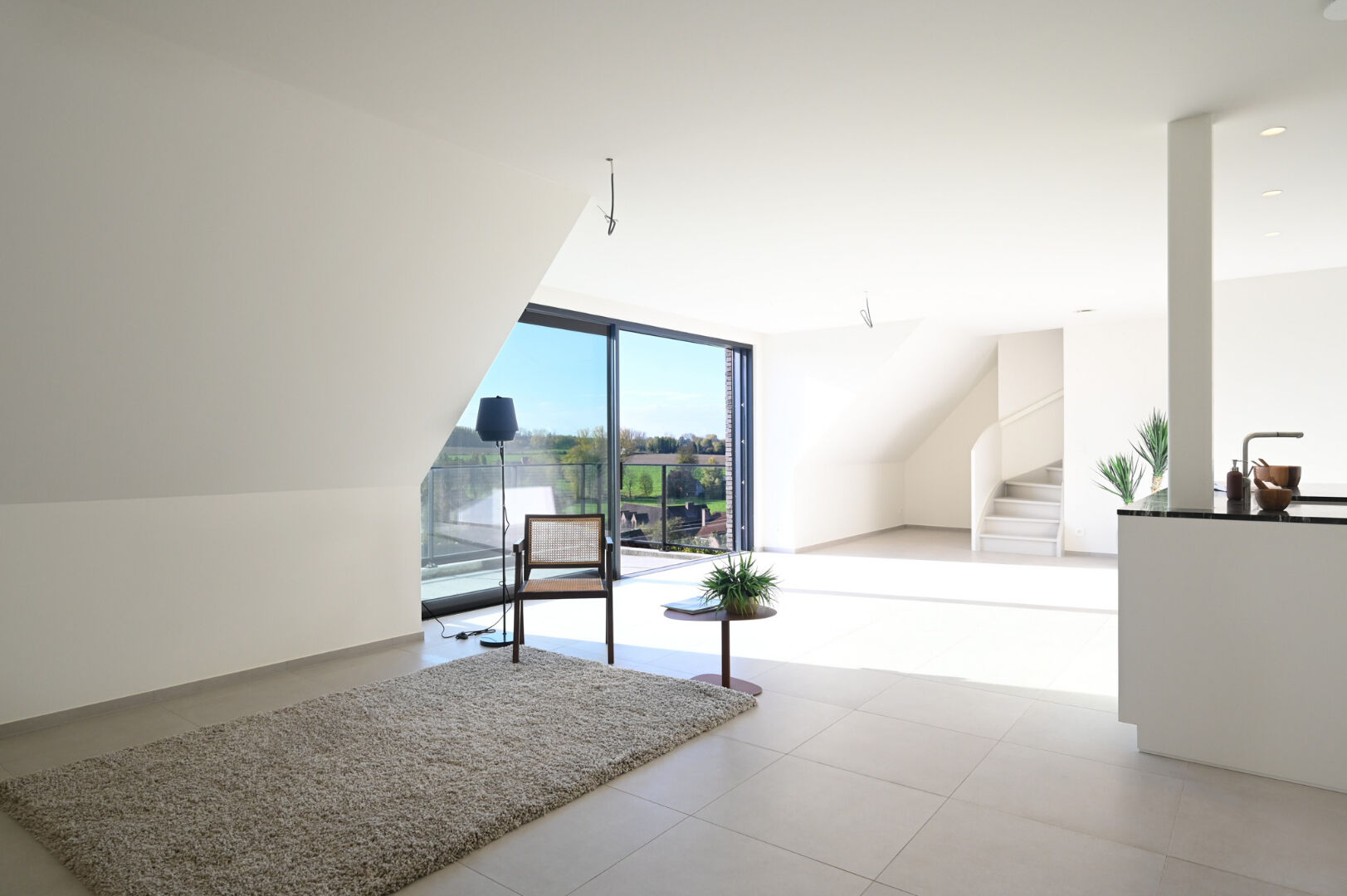 Het appartement strekt zich uit over twee verdiepingen en biedt op de eerste verdieping een royale leefruimte met open keuken, twee volwaardige slaapkamers, een stijlvolle badkamer met ligbad en inloopdouche, een afzonderlijk toilet en een praktische berging. Op de bovenverdieping bevindt zich de masterbedroom met extra zolderruimte, een tweede badkamer en een bijkomend toilet. Het zuidgerichte terras van ca. 13 m² vormt een naadloze verlenging van de leefruimte en biedt een weids uitzicht over de Vlaamse Ardennen.