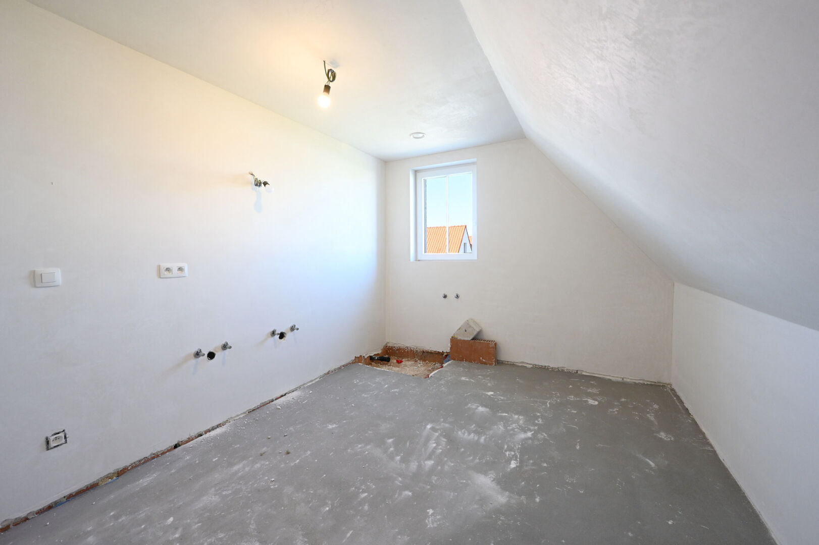 Op de eerste verdieping zijn er drie slaapkamers, samen met een extra afzonderlijk toilet, een technische berging en een badkamer voorzien van een ligbad en een dubbele wastafel. Op de tweede verdieping bevindt zich de zolder.