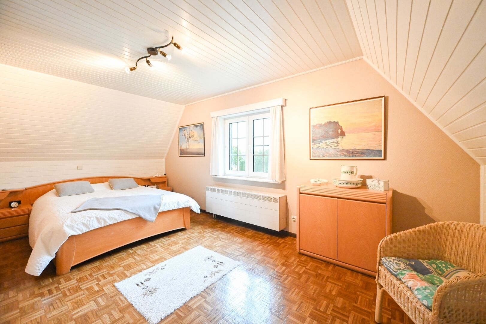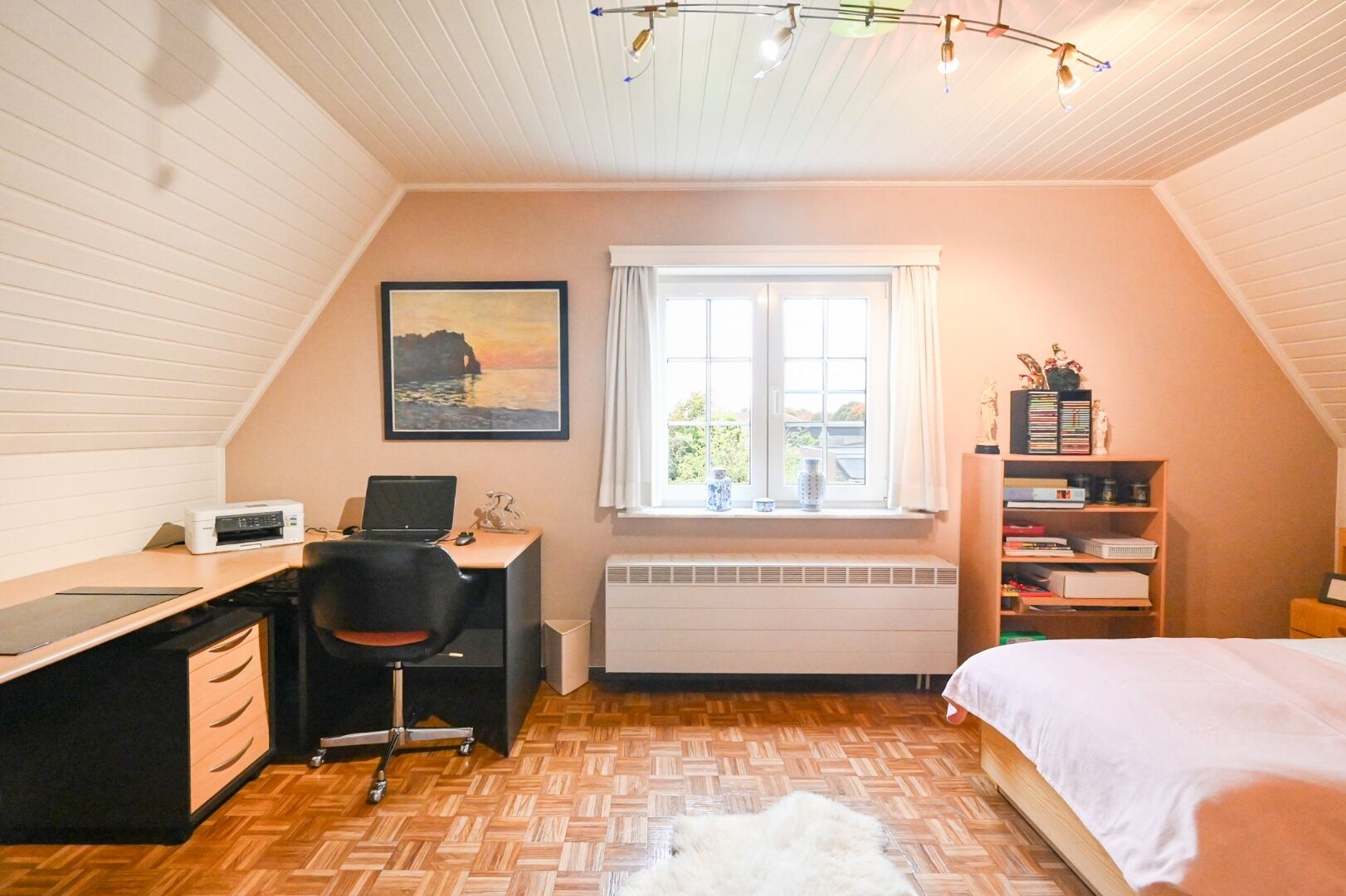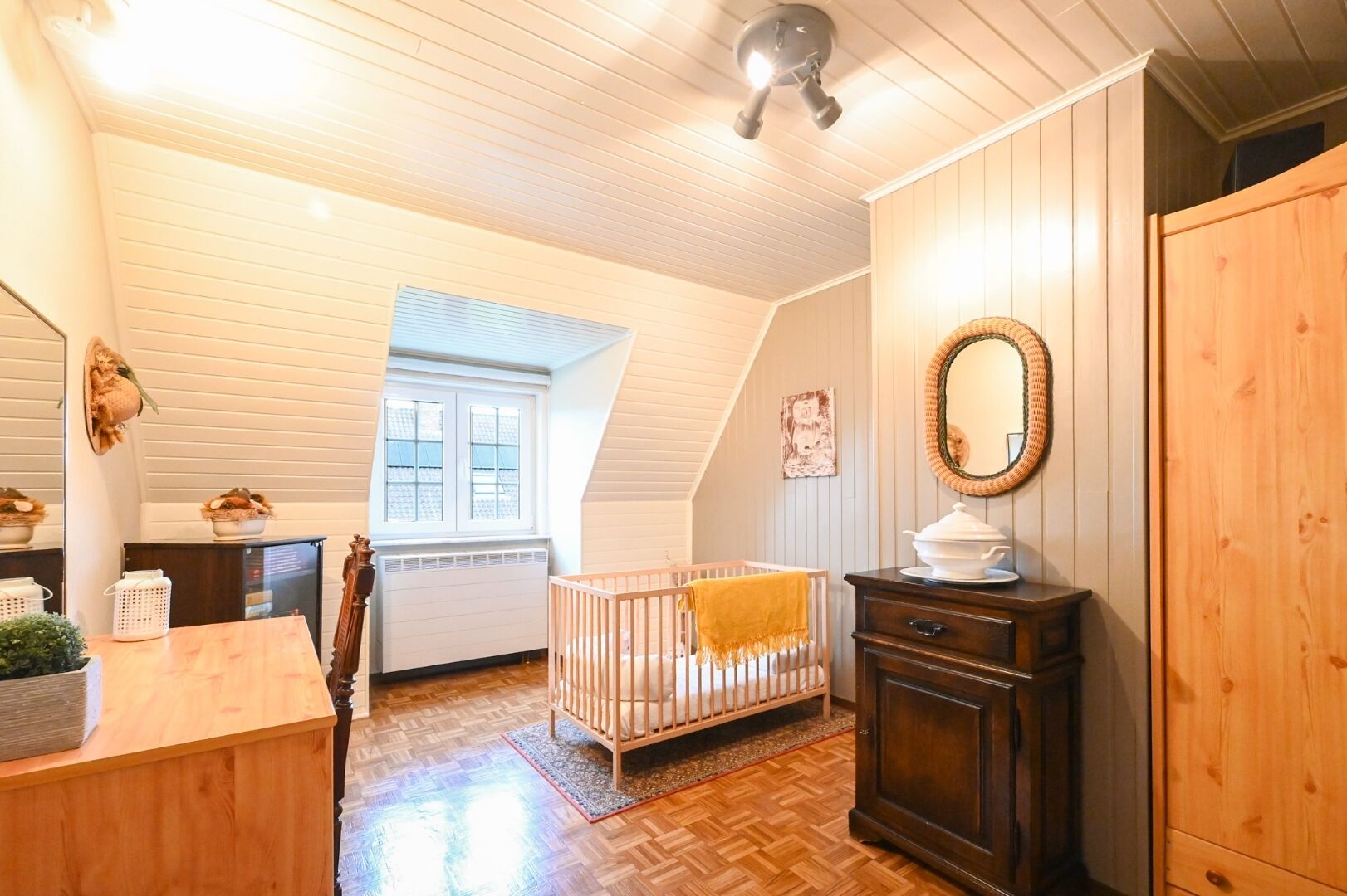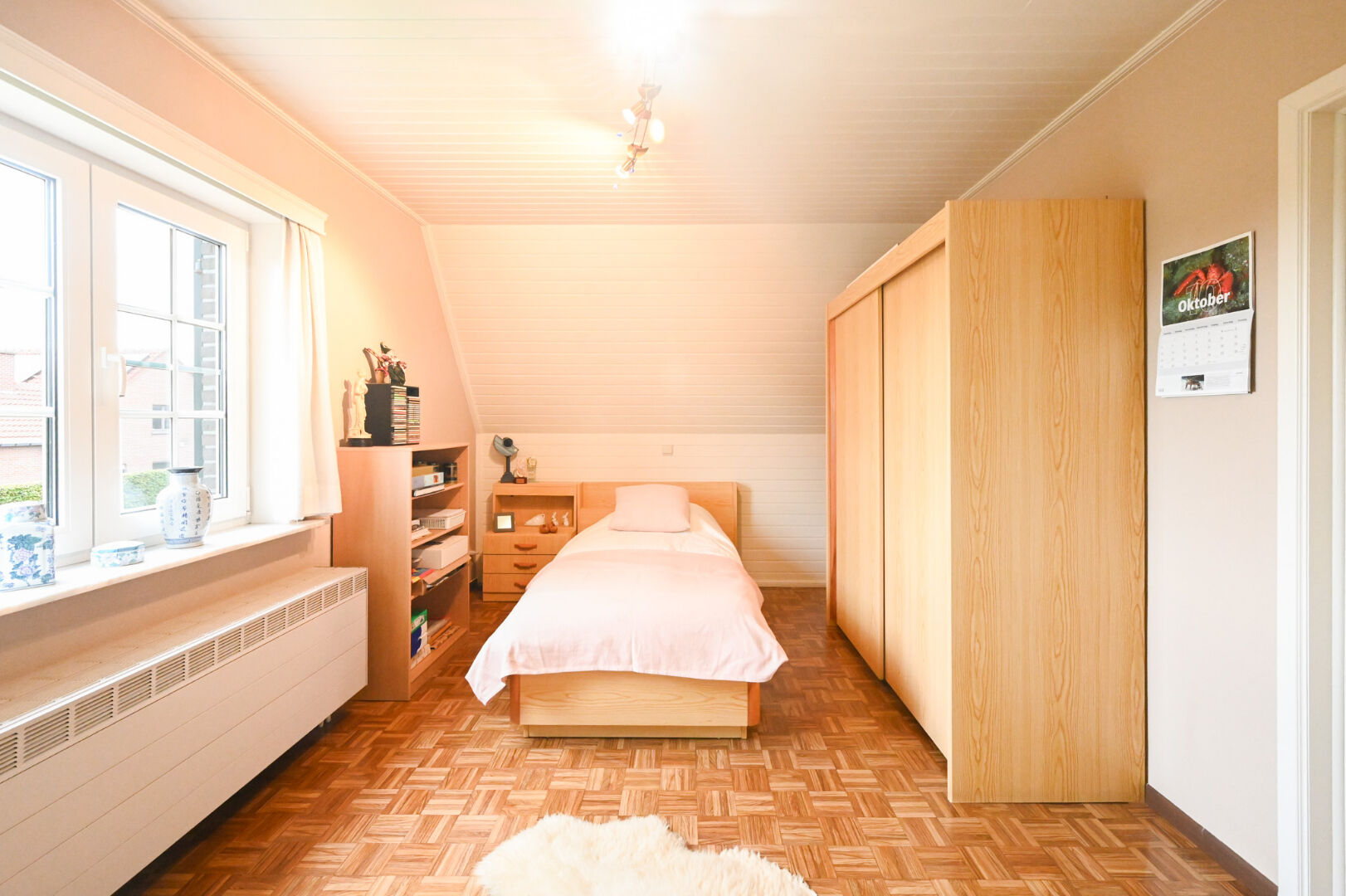 Op de eerste verdieping bevinden zich drie volwaardige slaapkamers, telkens met een aangename lichtinval. De verzorgde badkamer is uitgerust met een ligbad, dubbele wastafel en de nodige opbergruimte. De zolderverdieping is bereikbaar via een uitschuifbare trap en biedt bijkomende bergruimte of uitbreidingsmogelijkheden.