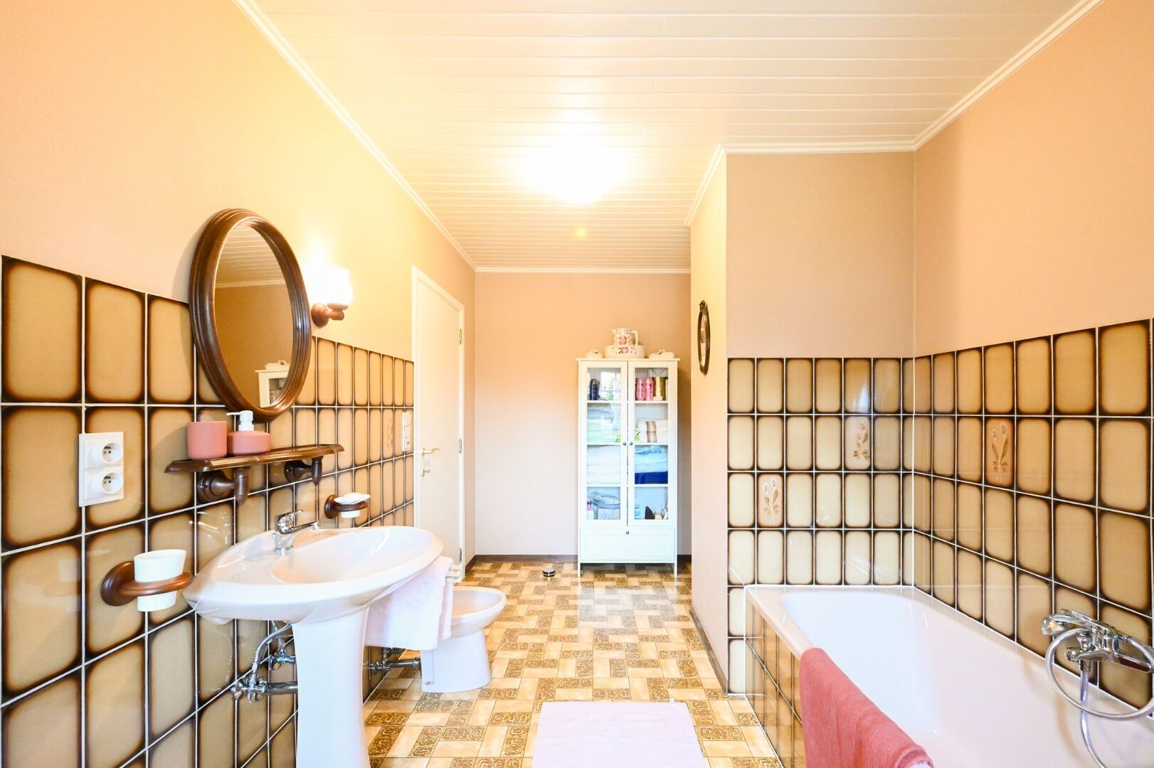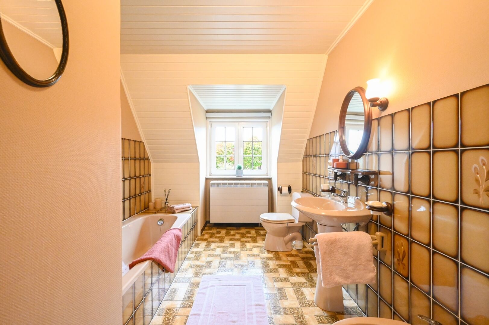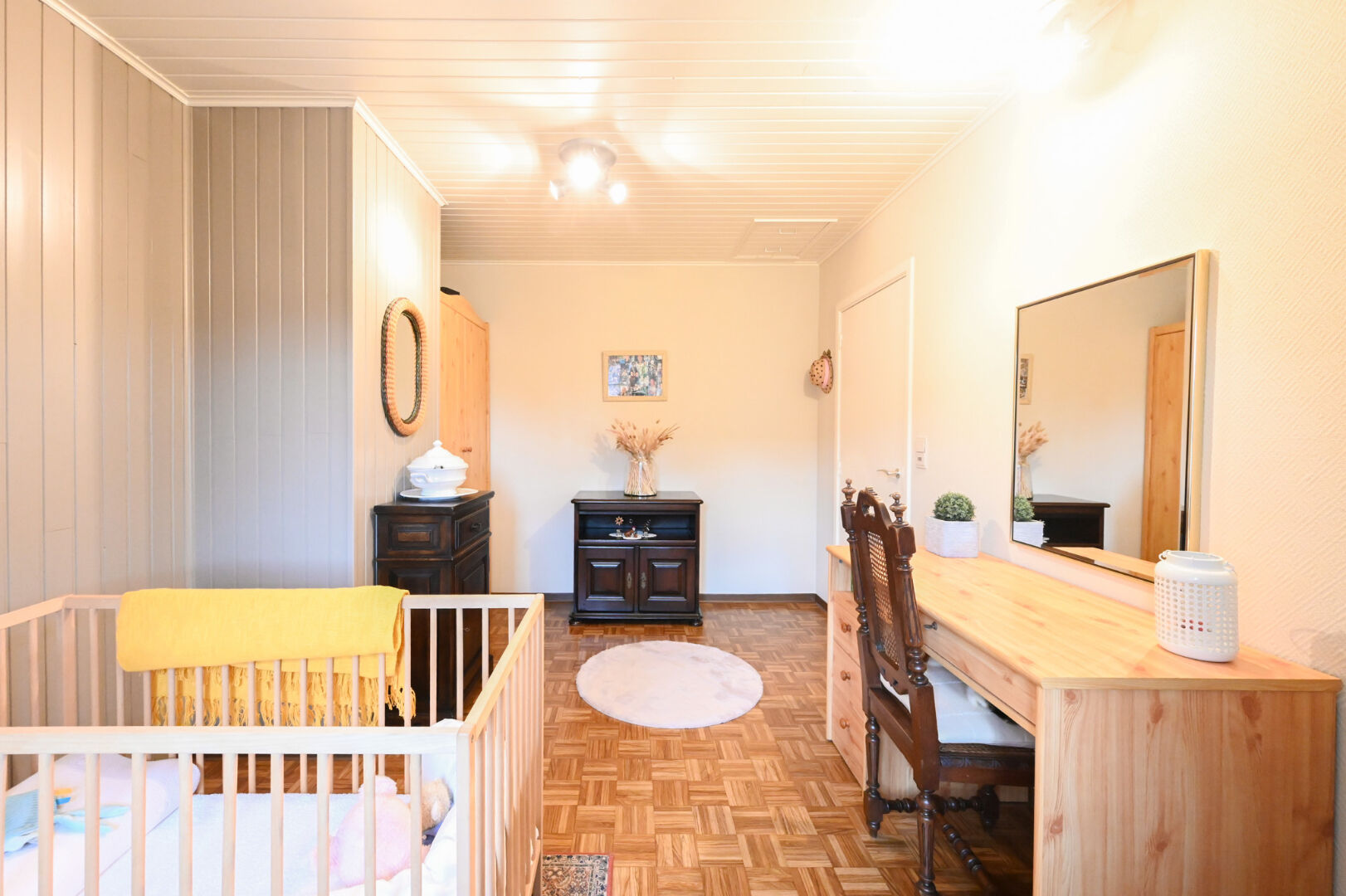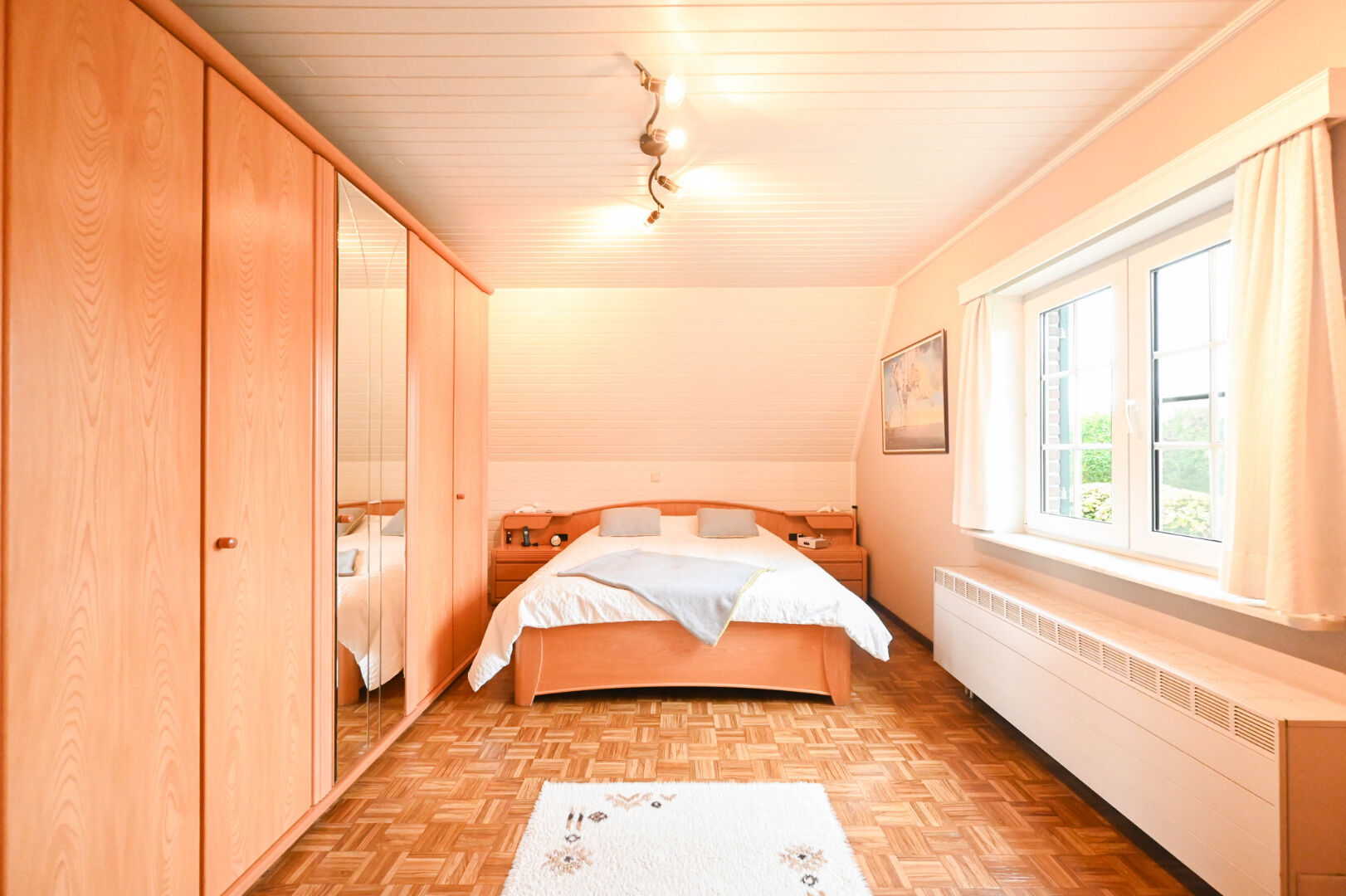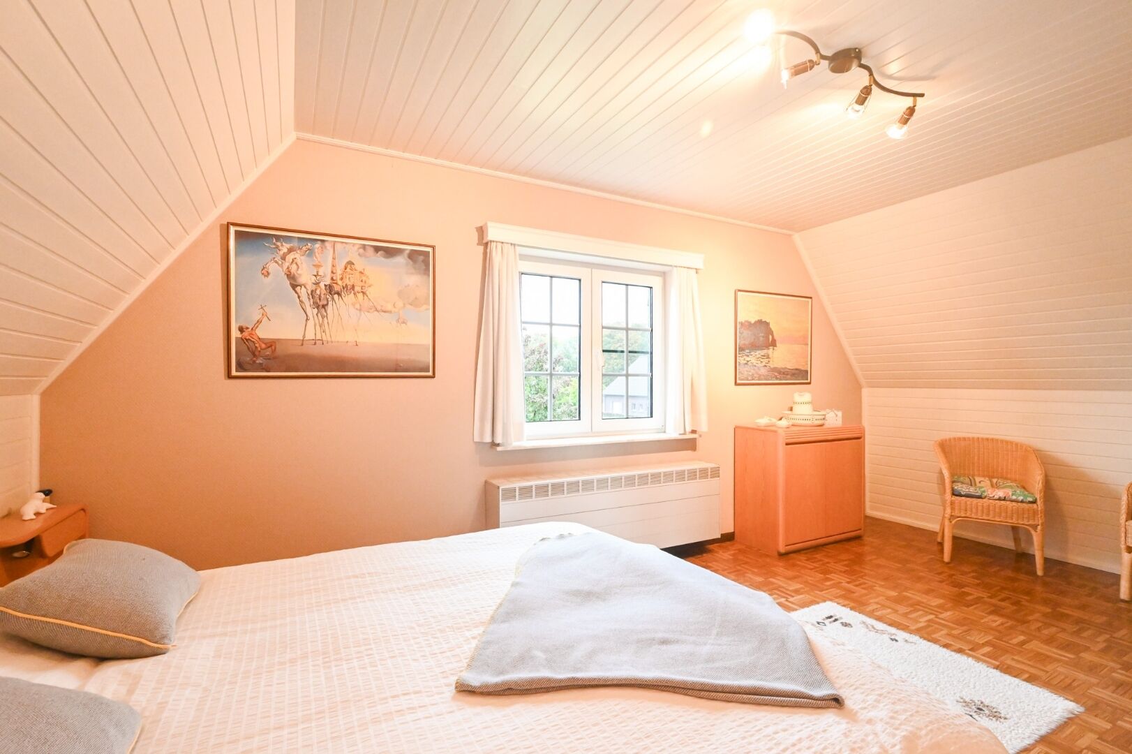 Op de eerste verdieping bevinden zich drie volwaardige slaapkamers, telkens met een aangename lichtinval. De verzorgde badkamer is uitgerust met een ligbad, dubbele wastafel en de nodige opbergruimte. De zolderverdieping is bereikbaar via een uitschuifbare trap en biedt bijkomende bergruimte of uitbreidingsmogelijkheden.