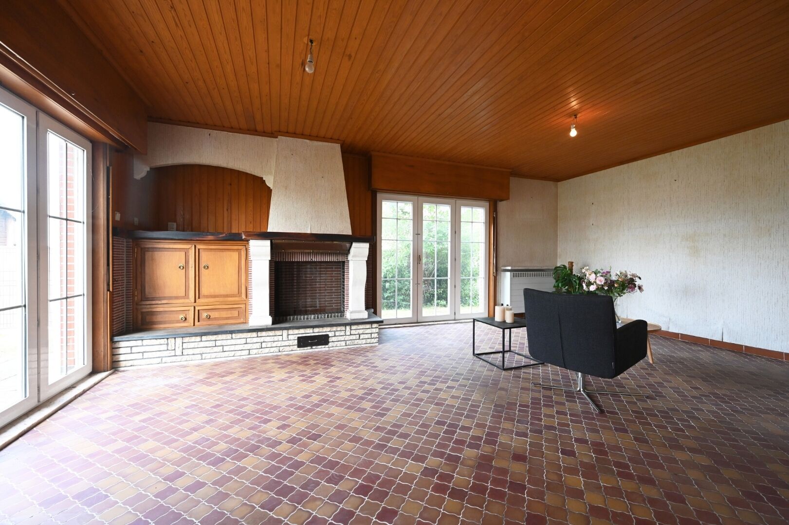 Deze woning biedt een solide basis en kan naar eigen smaak opgefrist worden zonder renovatieverplichting. De woning beschikt over een doordachte en praktische indeling. De ruime inkomhal met gastentoilet geeft toegang tot de lichtrijke woon- en eetkamer, die dankzij de grote raampartijen uitkijkt op het omliggende groen en de weidse vergezichten. Verder omvat het gelijkvloers aansluitend op de woonkamer een keuken met zicht op de tuin, een praktische wasruimte/bijkeuken, een koele berging en een inpandige garage.