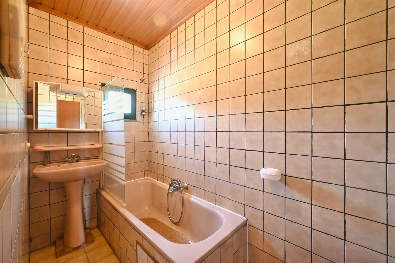 Bij het binnenkomen kom je terecht in de inkomhal die toegang geeft tot de leefruimte, eetplaats, keuken en andere vertrekken. De keuken is uitgerust met een oven, kookplaat en ingebouwde ijskast. Aansluitend bevindt zich de badkamer, ingericht met een ligbad en toilet. Op het gelijkvloers bevindt zich een slaapkamer.
