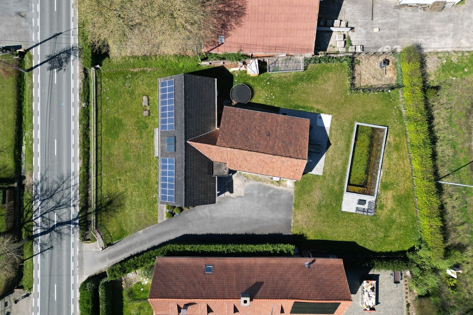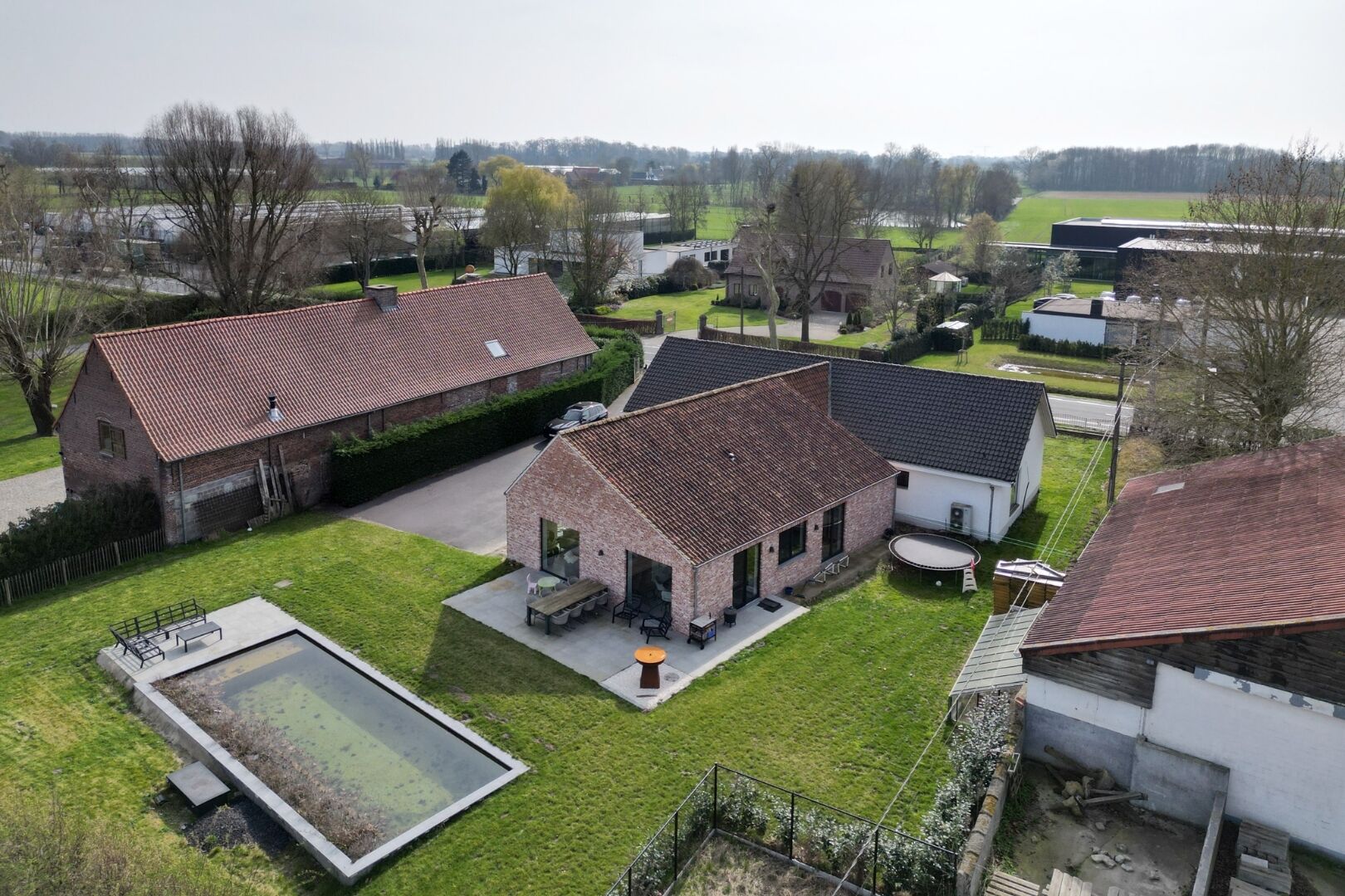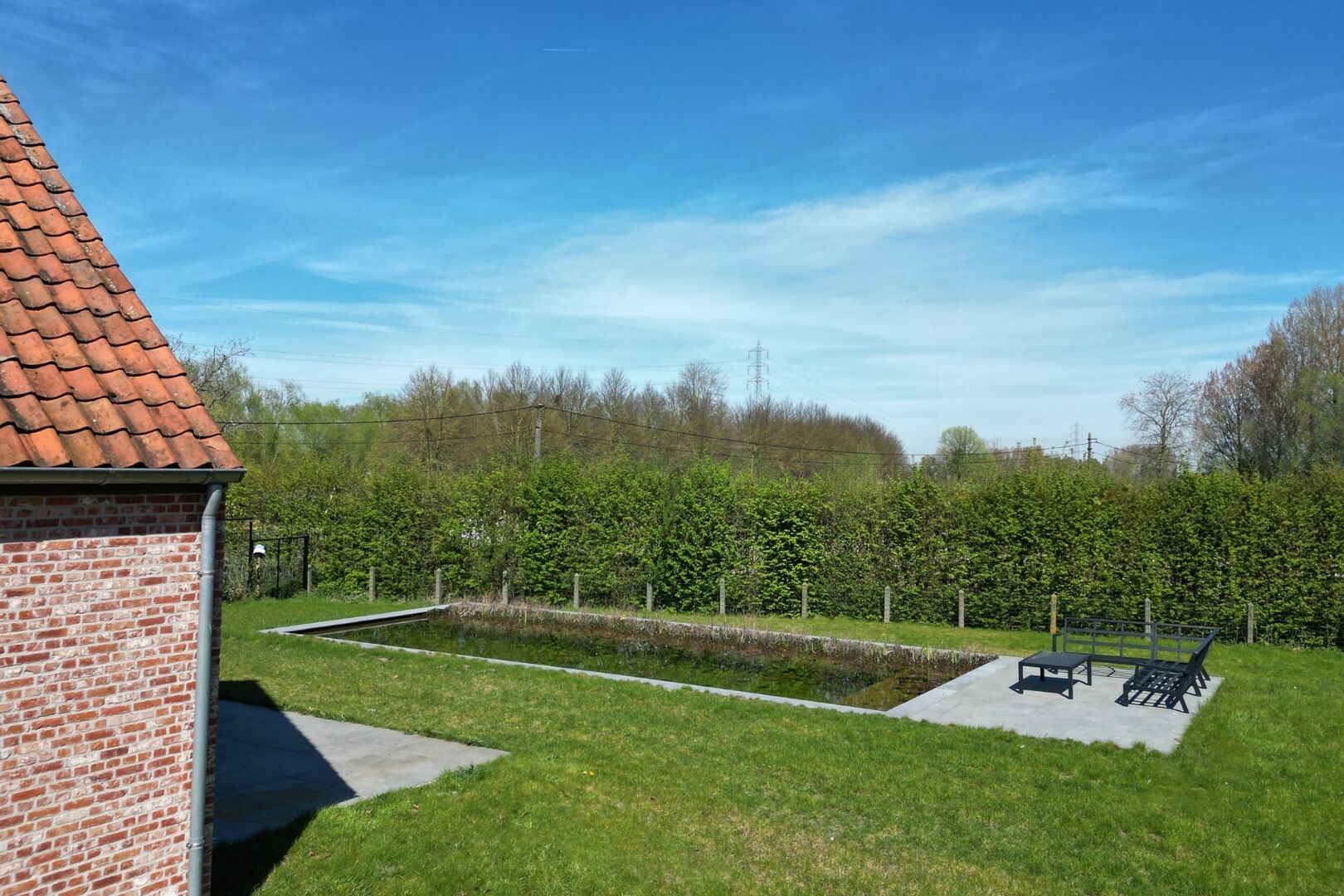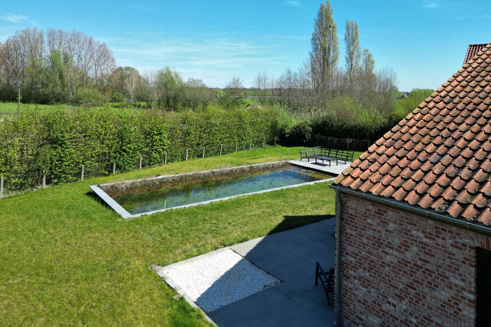 De tuin is gericht op ontspanning en buitenleven, met zonneterrassen en een zwemvijver die optioneel verwarmd kan worden via warmtepomp. De ruime oprit biedt plaats aan meerdere wagens.