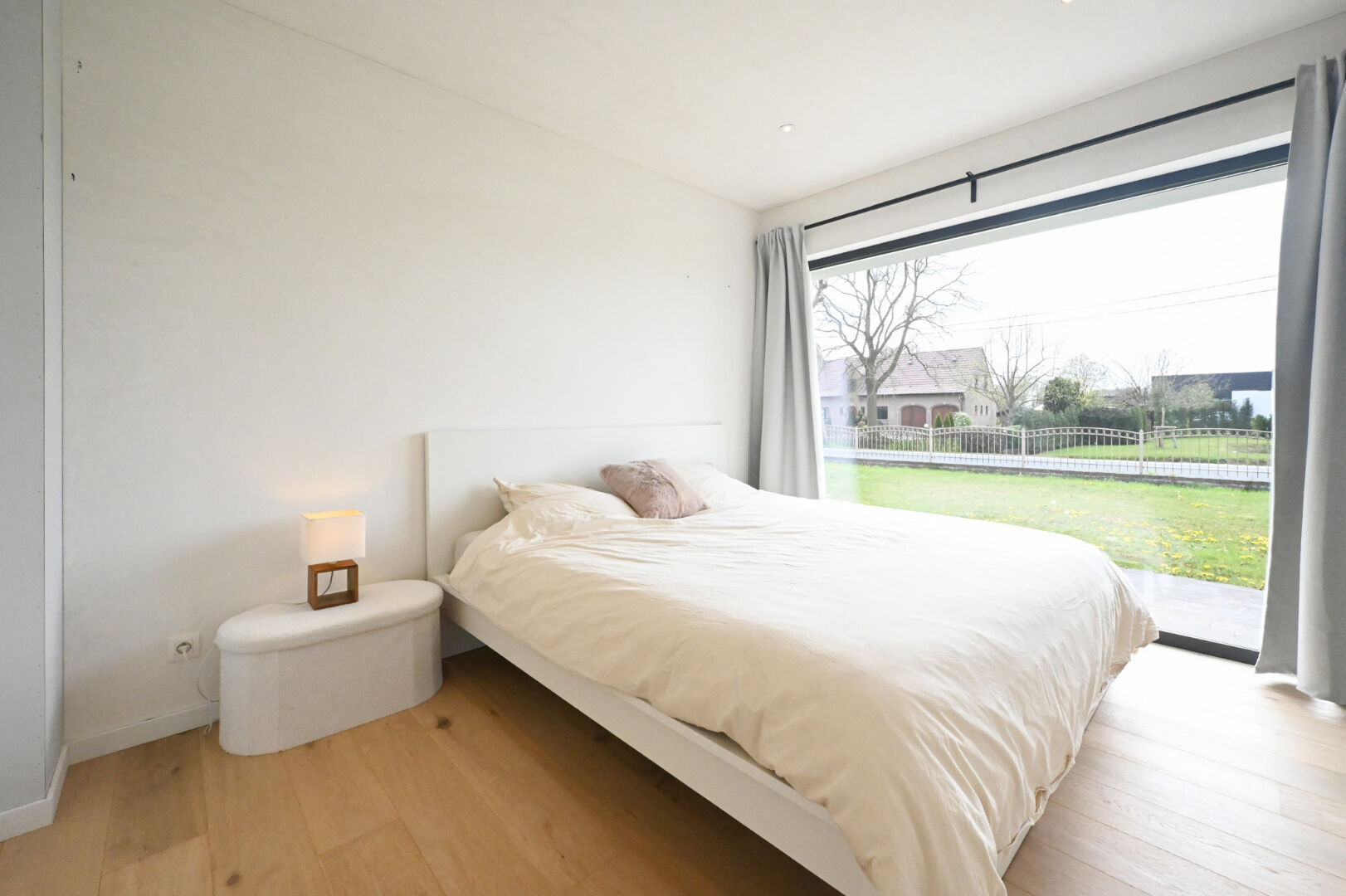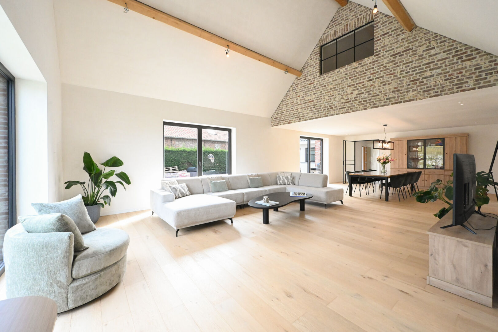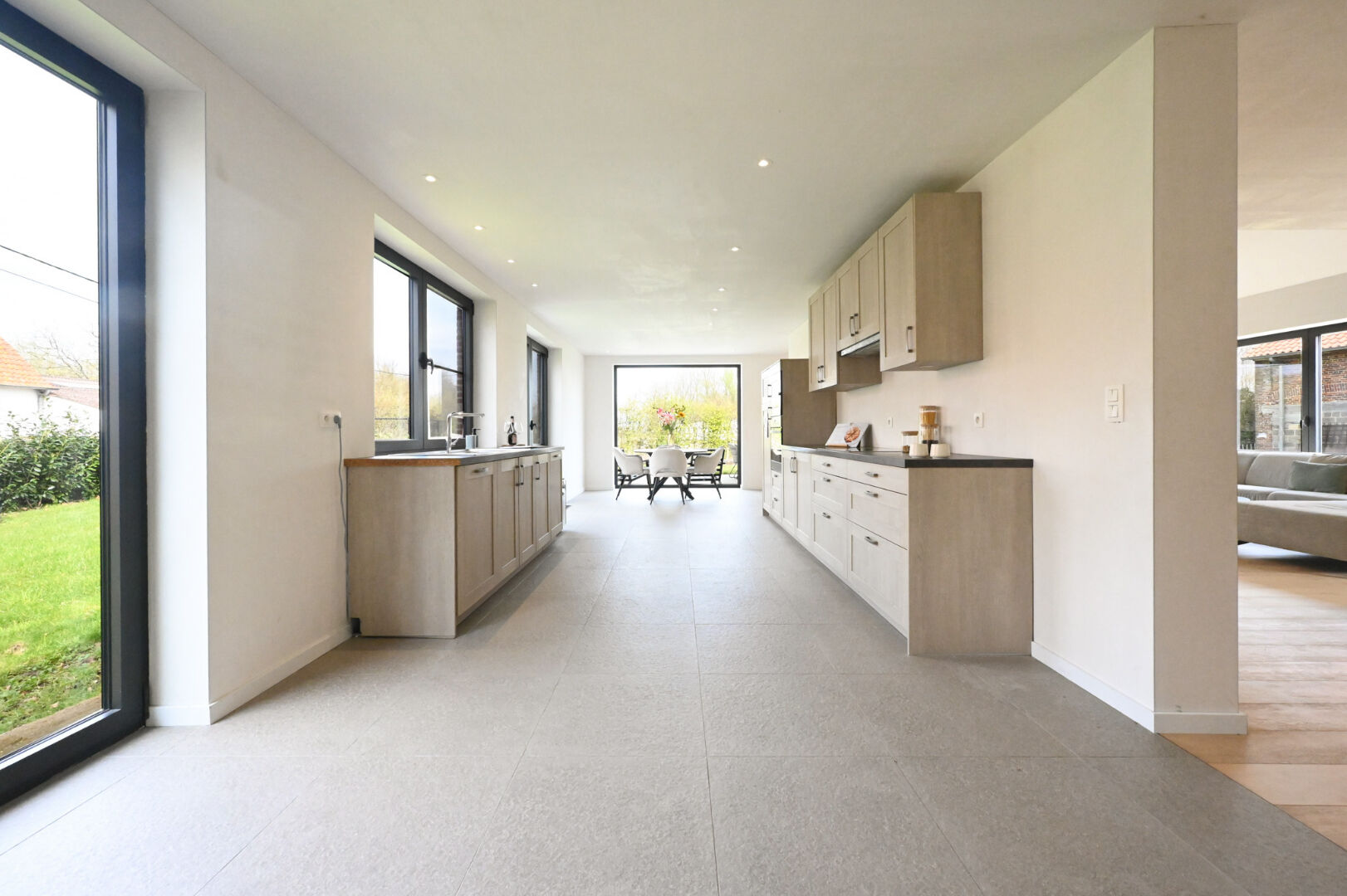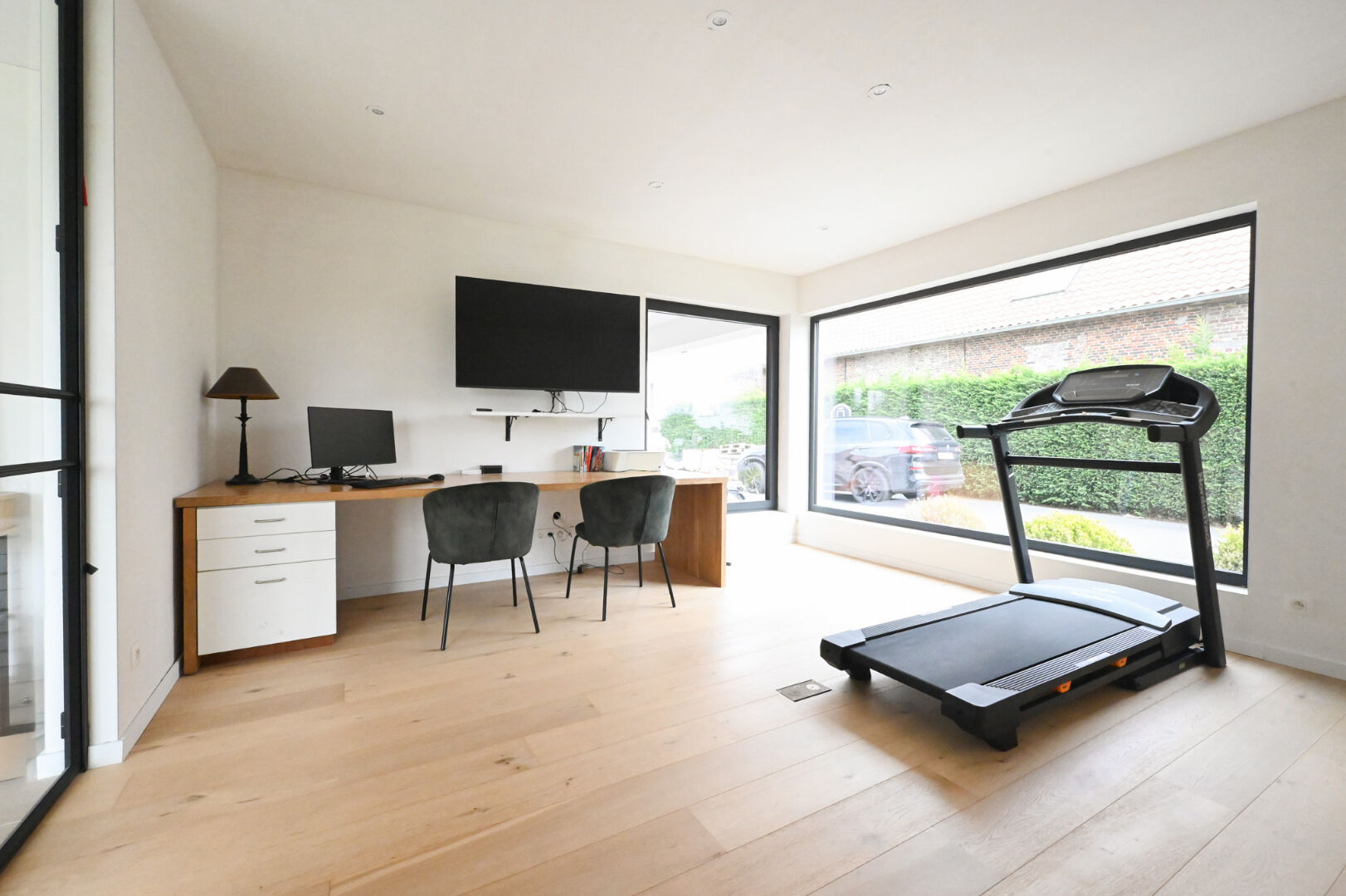 Op het gelijkvloers vindt u een ruime inkomhal met gastentoilet en bureauruimte, een lichtrijke leefruimte met open nok die het gevoel van ruimte versterkt, en een volledig uitgeruste keuken met kwalitatieve inbouwtoestellen en plaats voor een eetruimte. De keuken sluit aan op een praktische berging, terwijl een tweede inkom toegang biedt tot de was- en strijkruimte. Verder zijn er drie volwaardige slaapkamers, waaronder één met dressing, en een quasi volledig afgewerkte badkamer met dubbele lavabo, ligbad, inloopdouche en toilet.