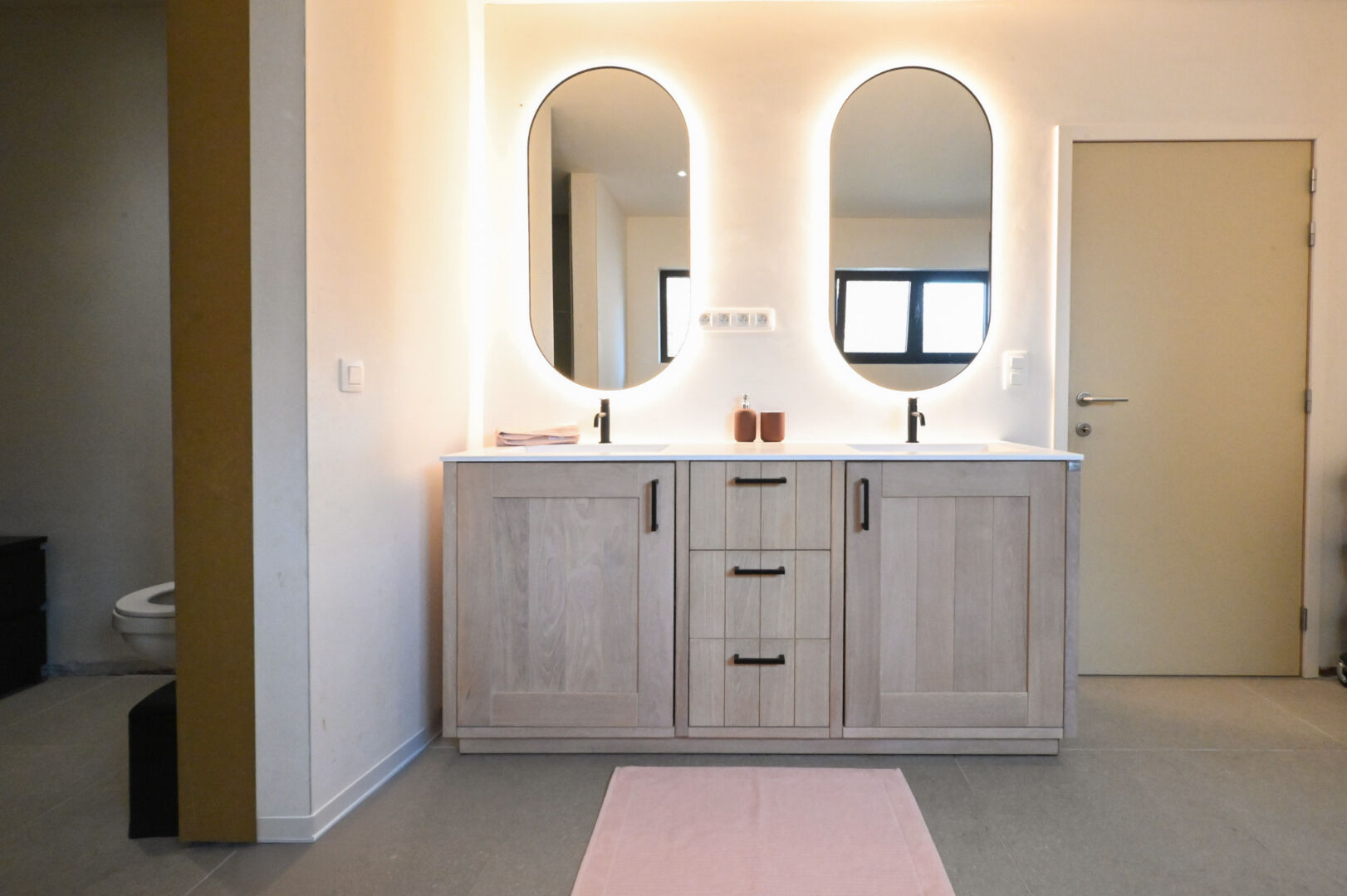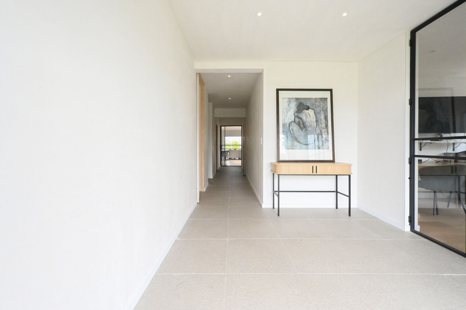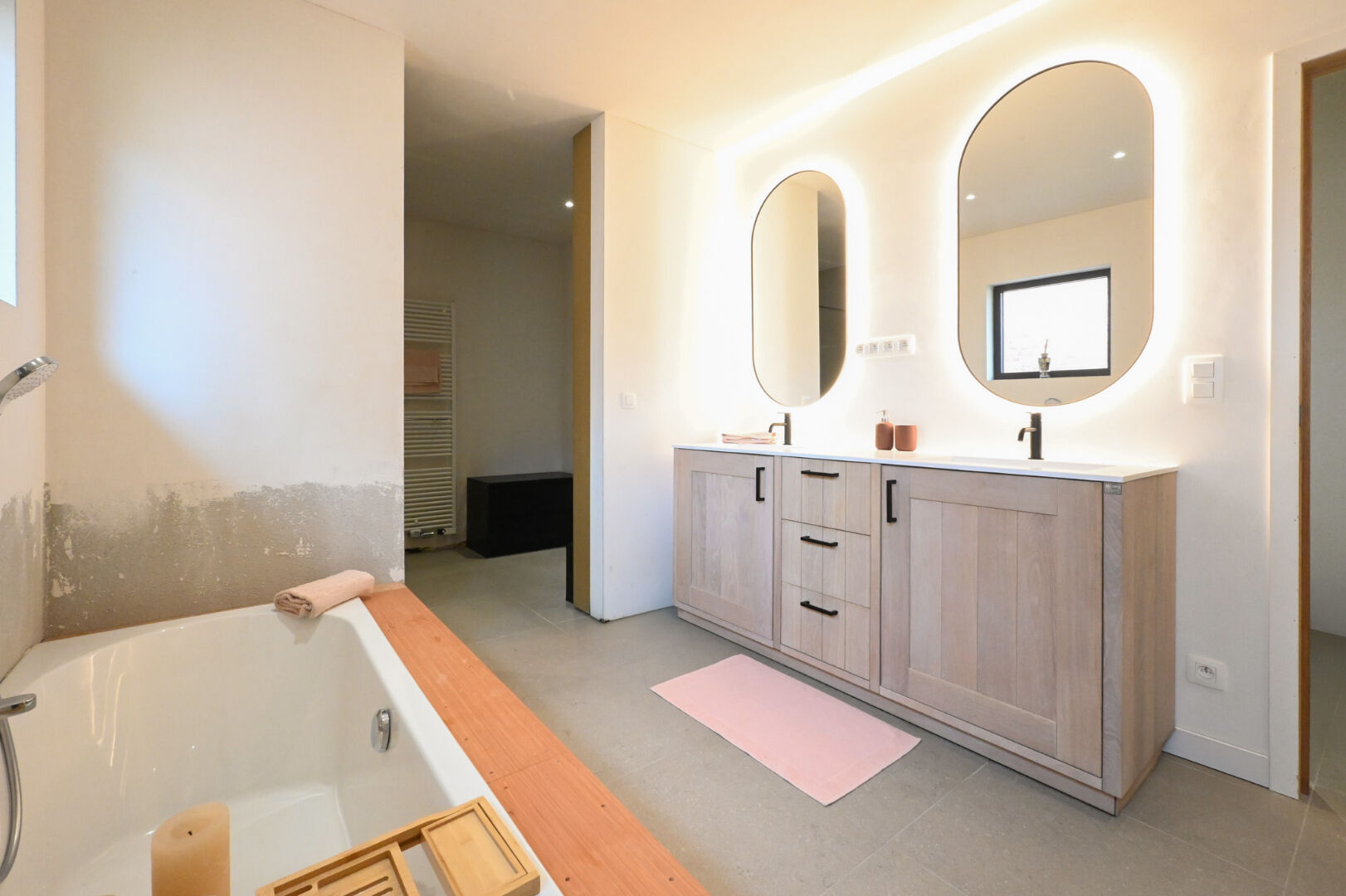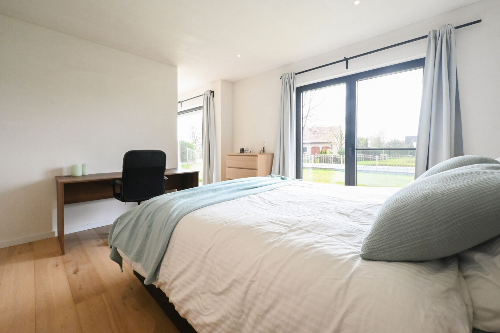 Op het gelijkvloers vindt u een ruime inkomhal met gastentoilet en bureauruimte, een lichtrijke leefruimte met open nok die het gevoel van ruimte versterkt, en een volledig uitgeruste keuken met kwalitatieve inbouwtoestellen en plaats voor een eetruimte. De keuken sluit aan op een praktische berging, terwijl een tweede inkom toegang biedt tot de was- en strijkruimte. Verder zijn er drie volwaardige slaapkamers, waaronder één met dressing, en een quasi volledig afgewerkte badkamer met dubbele lavabo, ligbad, inloopdouche en toilet.