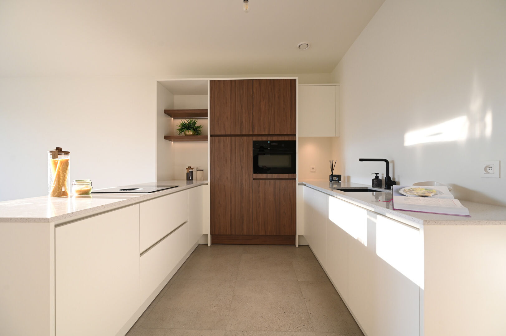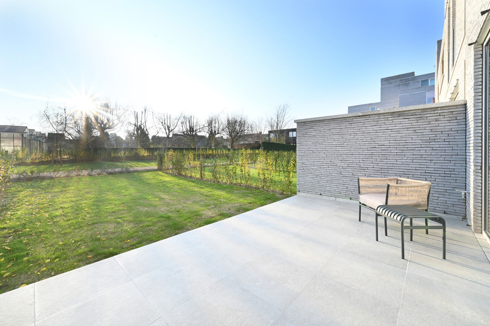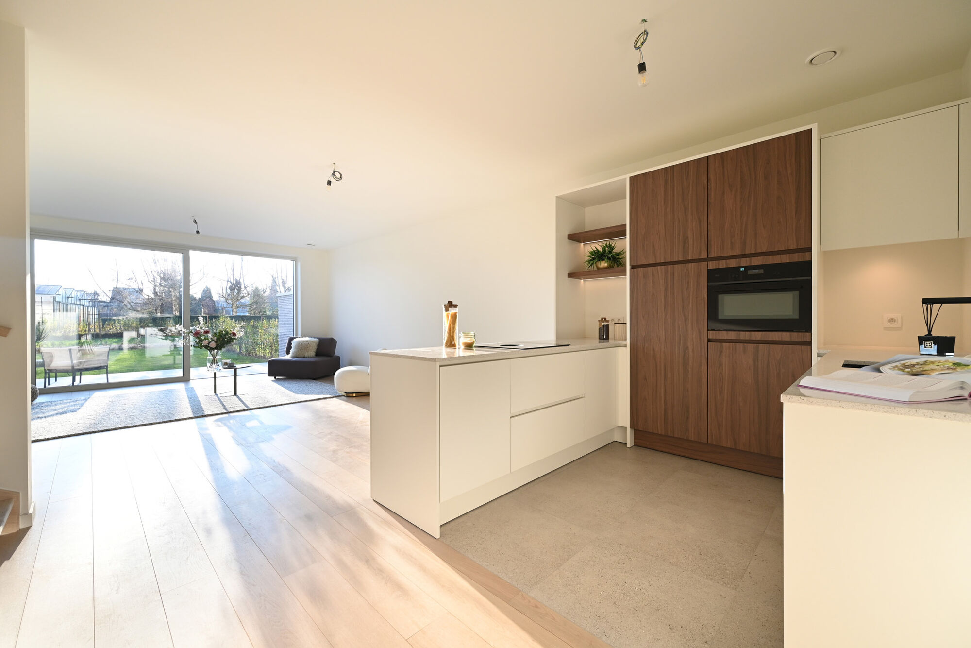 Deze schakelwoning van 192m² heeft op het gelijkvloers een inkomhal met gastentoilet en berging uitkomende in de woonkamer met open keuken. Via de grote schuiframen kom je op het zuidgerichte zonneterras van 17 m² met aansluitend de tuin. Op de eerste verdieping zijn er 2 slaapkamers waarvan één mastersuite met inloopkasten en en-suite badkamer. Op de tweede verdieping vind je nog eens 2 slaapkamers, een badkamer met inloopdouche en dubbele lavabo, een bureauruimte en het tweede zonneterras van 12.5 m² met zicht op de tuin. Achteraan de privatieve tuin bevindt zich een afgesloten, gemeenschappelijke tuin waar de kinderen veilig kunnen spelen.