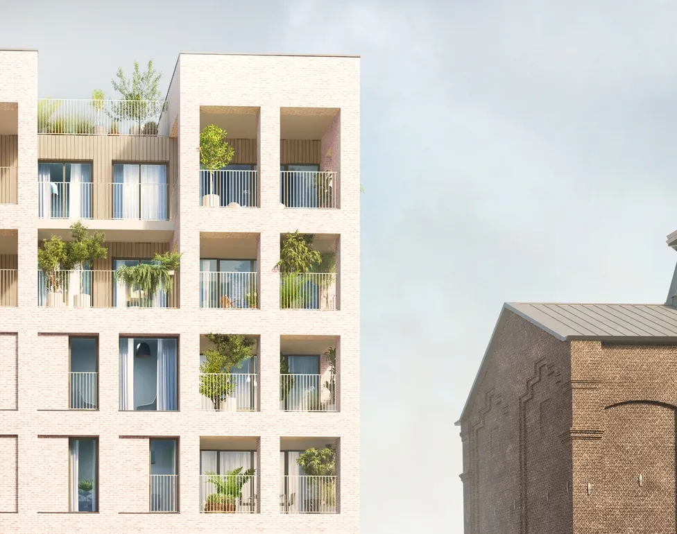 Zoals steeds in onze architectuur, zoeken we naar een verankering met de site, waarbij de geschiedenis en het gebouwde patrimonium worden meegenomen in de uitwerking van onze projecten. Aangezien de gebouwen binnenin de site van de Molens allemaal in baksteen zijn opgetrokken, was de keuze van ons hoofdmateriaal een evidentie. Door heden en verleden met elkaar te vermengen, zorgen we voor een doorgronde beleving van de plek. Een plek waarvan we hopen dat toekomstige bewoners zich er onmiddellijk thuis voelen.